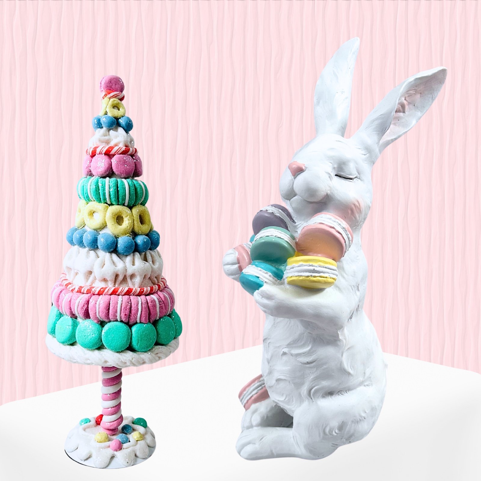 Easter Bunny Rabbit With Macaroons And Pastel Macaroon Tree Tabletop Resin NEW