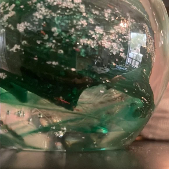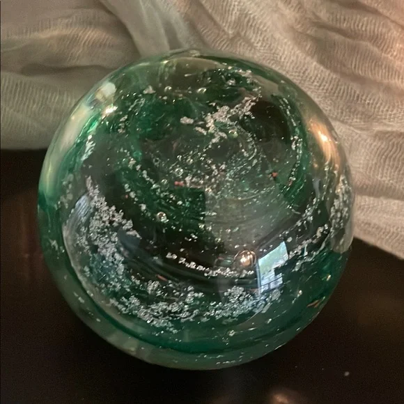 Enhance your home decor with this elegant green glass sphere. Its captivating design adds a touch of sophistication to any space.One of a kind glass sculpture made by artist Lisa R. RoweProduced 11/97 Signed Emerald green swirl with enhanced mother-of-pearl!!!A few faint flecks of red...This is a true gem and stunning piece of art!Excellent conversation piece to display anywhere!Offers considered.Ask your questions.One owner!Shipped insured!