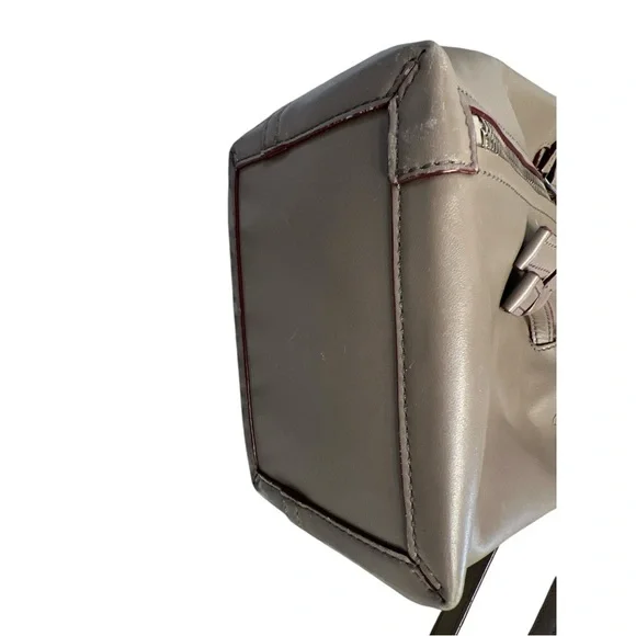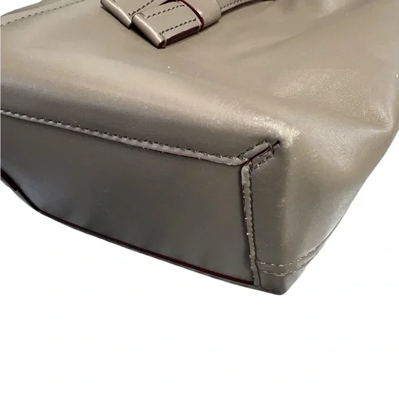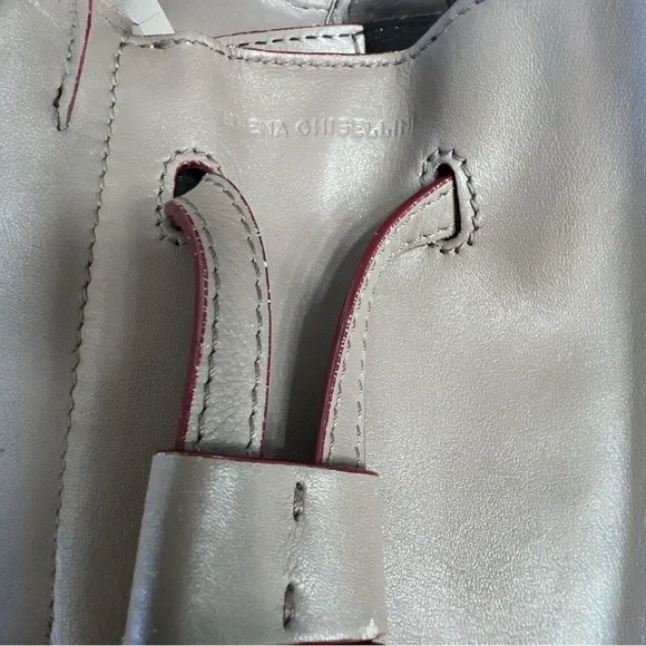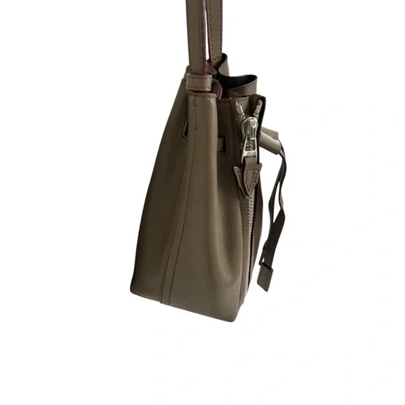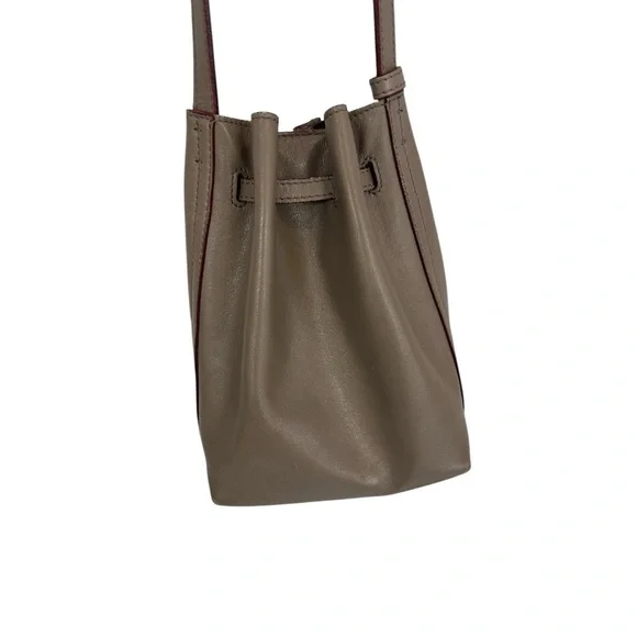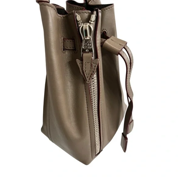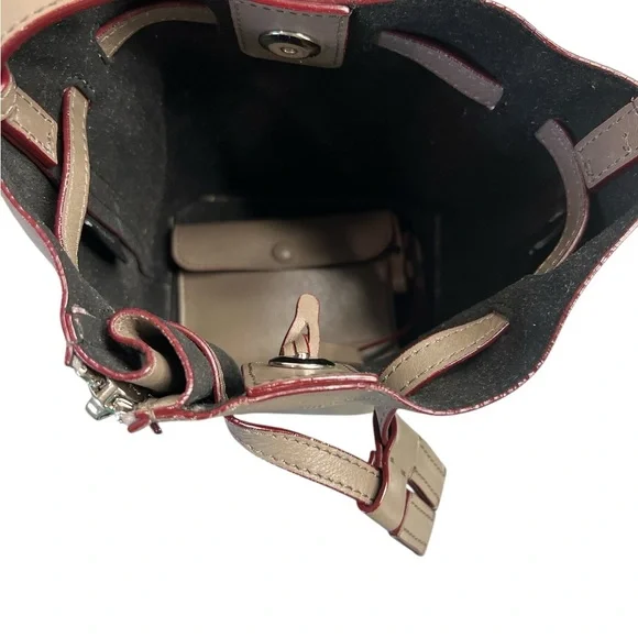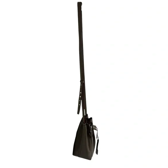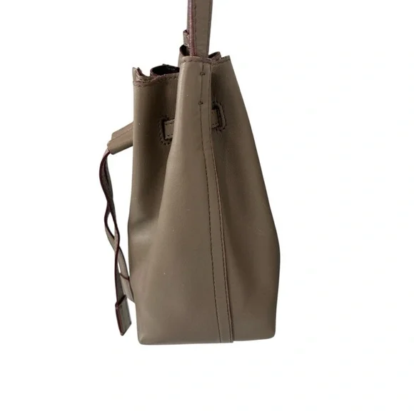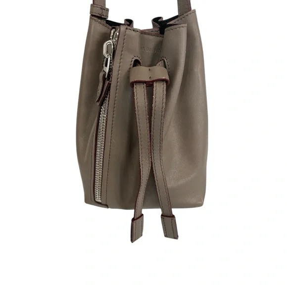 This bag is a bucket style design, fixed shoulder strap and is complete with a small buttoned pouch which can be attached to the bag.Long adjustable strap allows this bag to be a crossbody.Very soft leather and the perfect size.Some wear visible on bottom corners, see pictures. Approximate measurements 8”x7”x4”