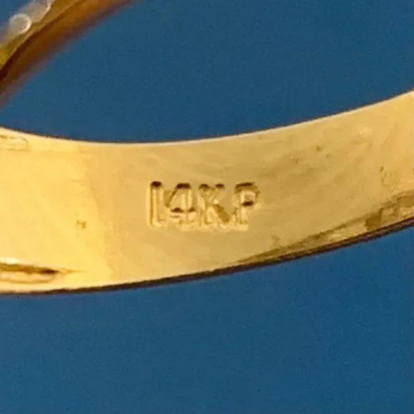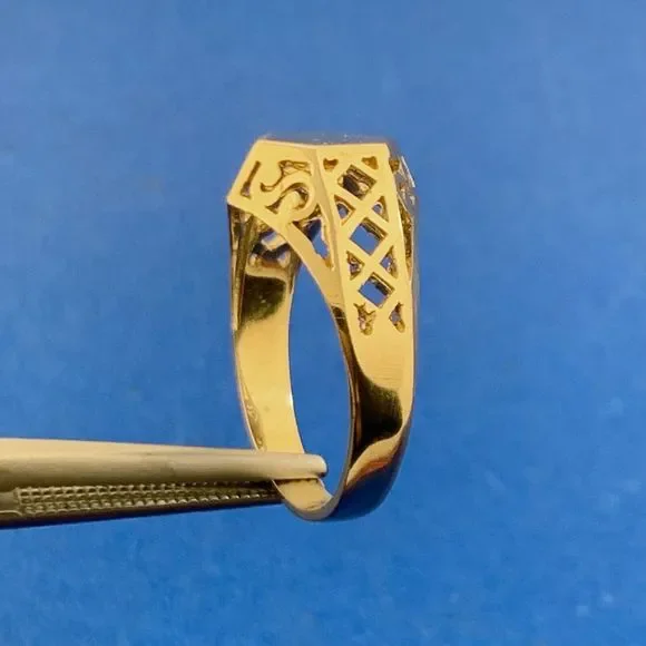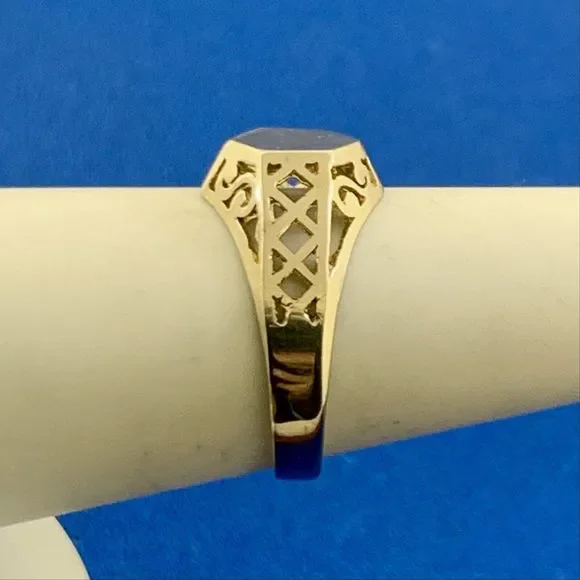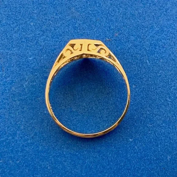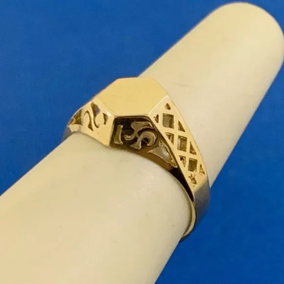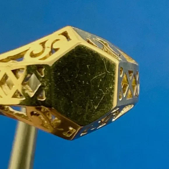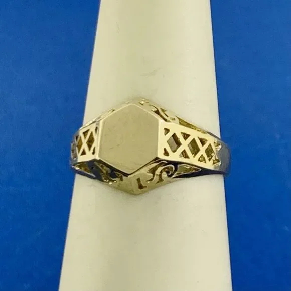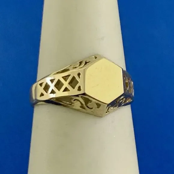 * Engravable Hexagon Top 14KP Yellow Gold Filigree Detail Size 6.25 Ring* Ring size: 6.25* Band width: 2.65 mm to 4 mm* Height: 1/8"* Top of ring measures: 7/16" by 11/16"* Engraveable space measures: 5/16" by 1/4"* Weight: 2.7g* Marked: 14KP * Ring can be resized for an additional fee.* Condition: As pictured.* G3950