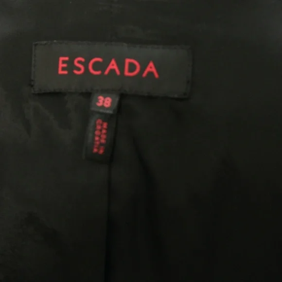 GUARANTEED AUTHENTIC ESCADA CLASSIC BLACK WOOL BLAZERDesign:- Classic wool blazer in black.- Looks great paired with jeans or dressed, very comfortable.- Notched lapel, front center button closure.- Dual flap pockets at hips, stitched closed.- Long sleeve.- Rear vent, lined.Fabric: 99% Wool, 1% ElastaneSize: 38Measurements (Approximate laid flat):- Shoulder to Shoulder: 16.5"- Underarm to Underarm: 19"- Sleeve Length: 25"- Total Length: 26.5" (tip of back collar to bottom front center hem)To Our Customers: -We consider it a privilege to serve as your luxury fashion concierge.Whether you are looking to buy that special one-of-a-kind item, (that no one else can find),scoring a spectacular deal on a pre-owned gem orupdating your own style by consigning your items,please don't hesitate to contact us.Remember, You Deserve No Less!Condition: Excellent- Worn gently, light expected wear to fabric with limited use.- No visual signs of excessive wear or damage.- Please Note, This jacket is Pre-owned.We make every effort to make note of all visible exceptions.Please review all detailed pictures carefully and ask questions prior to purchase.