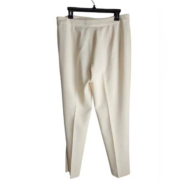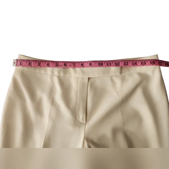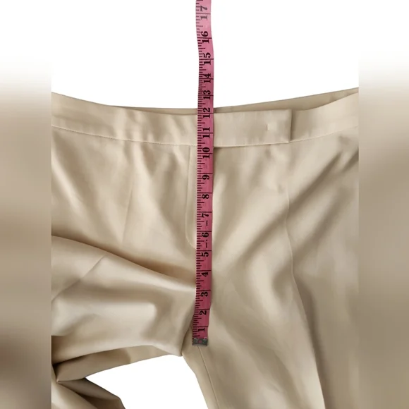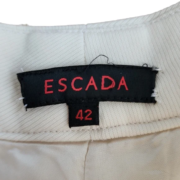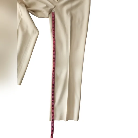 Escada Trousers Ivory Wool Blend Size 42. C0750.Pre-owned great condition trousers.These Escada dress trousers are made out of wool blend material and come in Ivory/cream color.They are fully lined. No pockets; zipper and hook closure.Perfect for weddings, the officePlease see the photos for measurements.