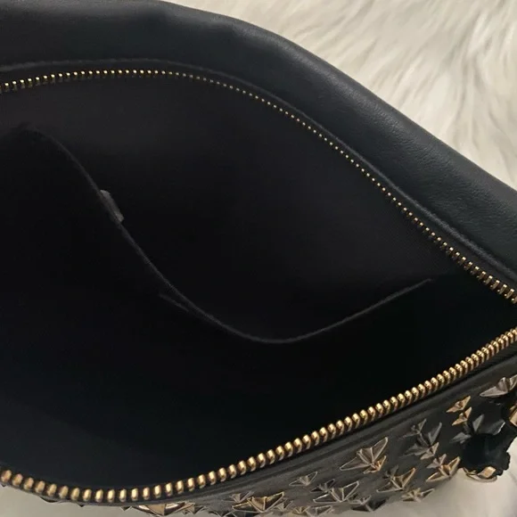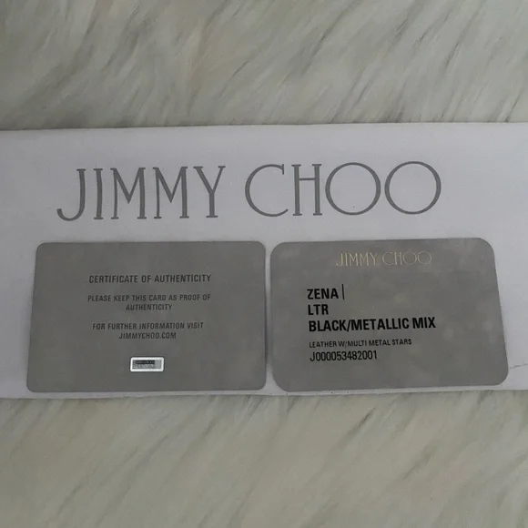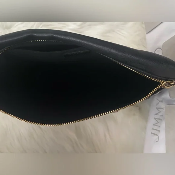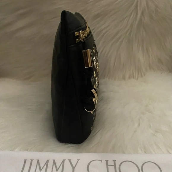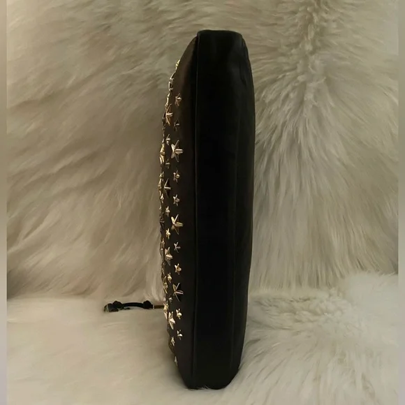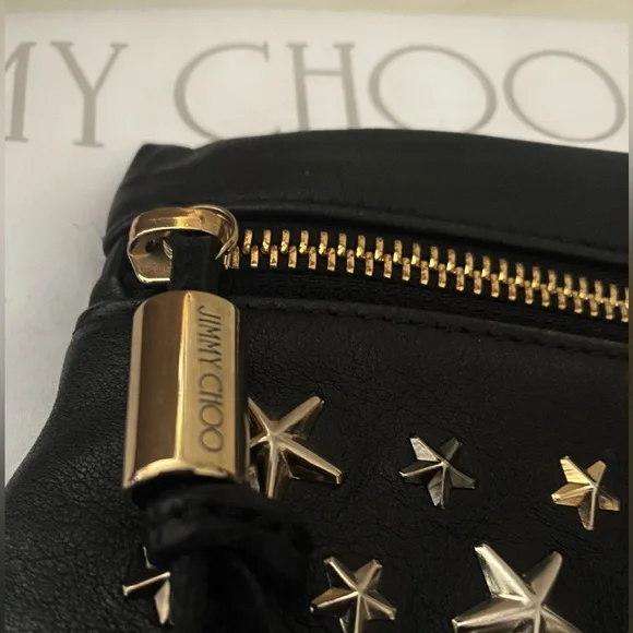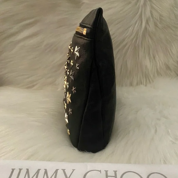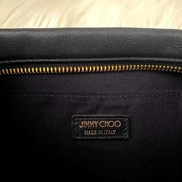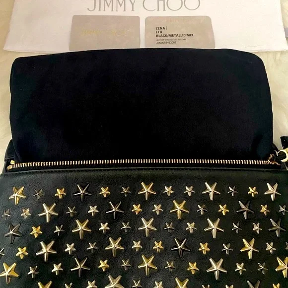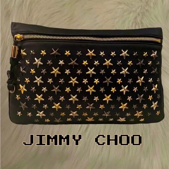 EUC Authentic Jimmy Choo clutch - Large Black clutch with one zippered pocket inside. A wristlet strap can probably be added, see size of zipper pull tab for measurements. Large roomy clutch! Please see photos for description. EUC clutch. Inside is clean. Some discoloration on leather but overall EUC. Gold and silver hardware some hardware tarnishing. All stars are intact. Dust bag and authentication card included. Ready to use or add to any collection.Questions? Leave a comment below!