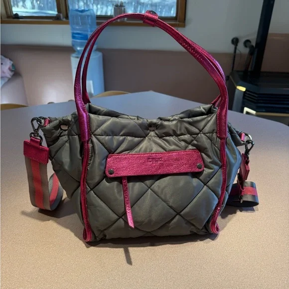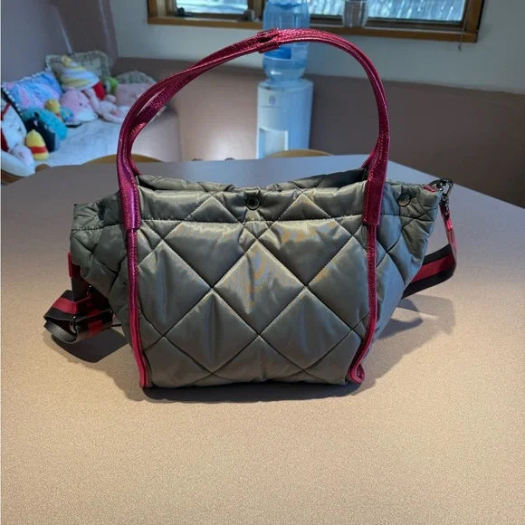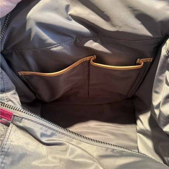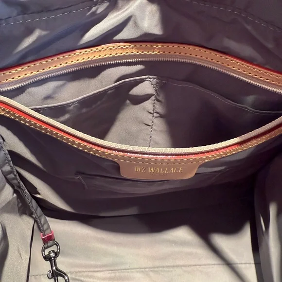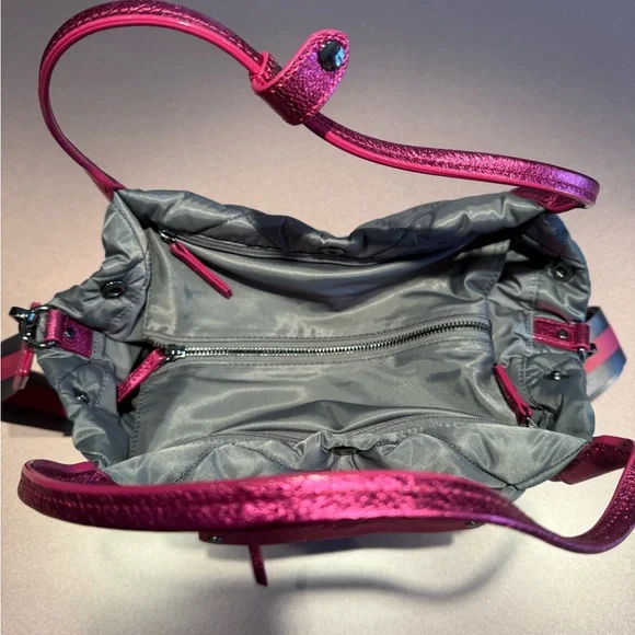 Excellent used condition/Measures approximately 10 inches length, 11 inches height, 8 inches depth/Large main compartment includes key fob, business card holder, 2 slip pockets, one zip pocket with two slip pockets inside/Two zip pockets on either side of main compartment/zip pocket on front/PLEASE NOTE: DETACHABLE POUCH NOT INCLUDED/Message me with any questions/I love offers!