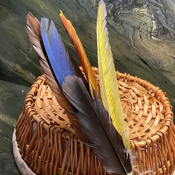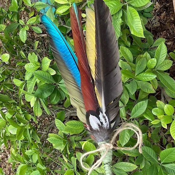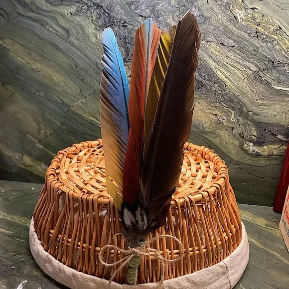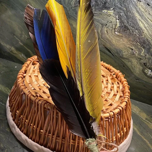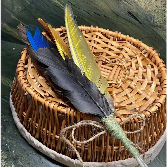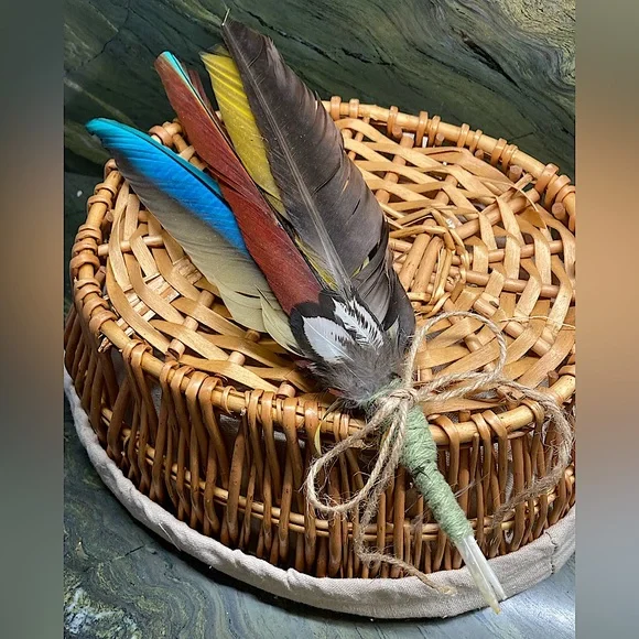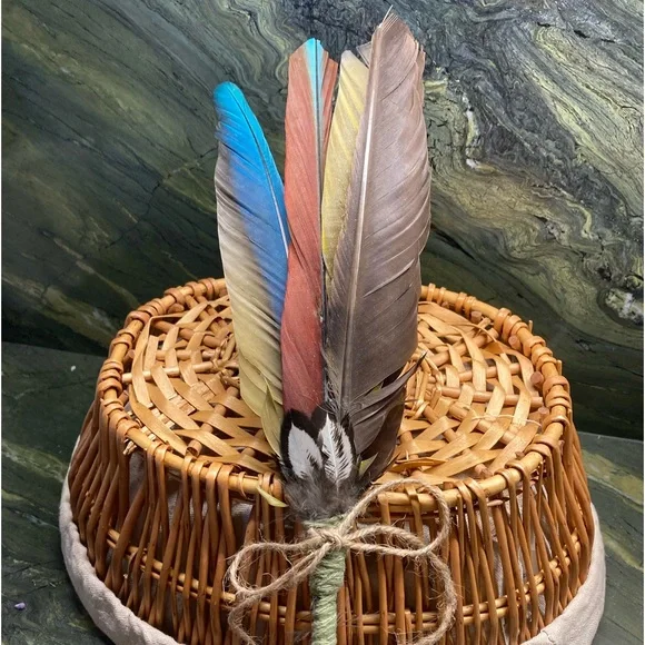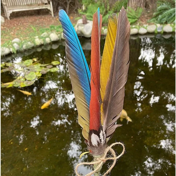 All Natural Feather Hand Fan Artwork.Home Decor.Hand Crafted, handmade, artisan.Fancy, Calming, Relaxing, Romantic, Colorful, Softness.Handmade by me, Randee.Approx 12” tall x 4” wide.Unique Feather Fan Artwork is a soft and natural beauty.Tied at the base with all natural cotton string and set with adhesive.Adorned with a natural jute bow.This gorgeous feather fan artwork is made with outstanding all natural colors that shine and reflect all types of lighting.Absolutely stunning feather colors: black, dark chocolate brown, deep rust, vibrant cobalt turquoise blue, deep gold, bright lemon yellow.Adorned at the base with fluffy deep sienna, gray, and off white with a fabulous natural leafy shaped pattern and little tufts of fluff.Soft and lovely as a natural basket decor or display on your wall for a boho vibe.Handmade and completely designed by me, Randee.Nature, farmhouse, fairycore, cottagecore, gift, holiday, Boho, wall decor, Mother’s Day This vibrant, uplifting feather fan is shown with indoor, outdoor, and backlighting.You will receive the exact feather fan shown in this listing.Arrives Gift Wrapped.Fan# 7All photos taken by me, Randee.Copyright ©️@randeescloset.*All of my Sage and other Handcrafted Farm items are approved Posh Compliant.
