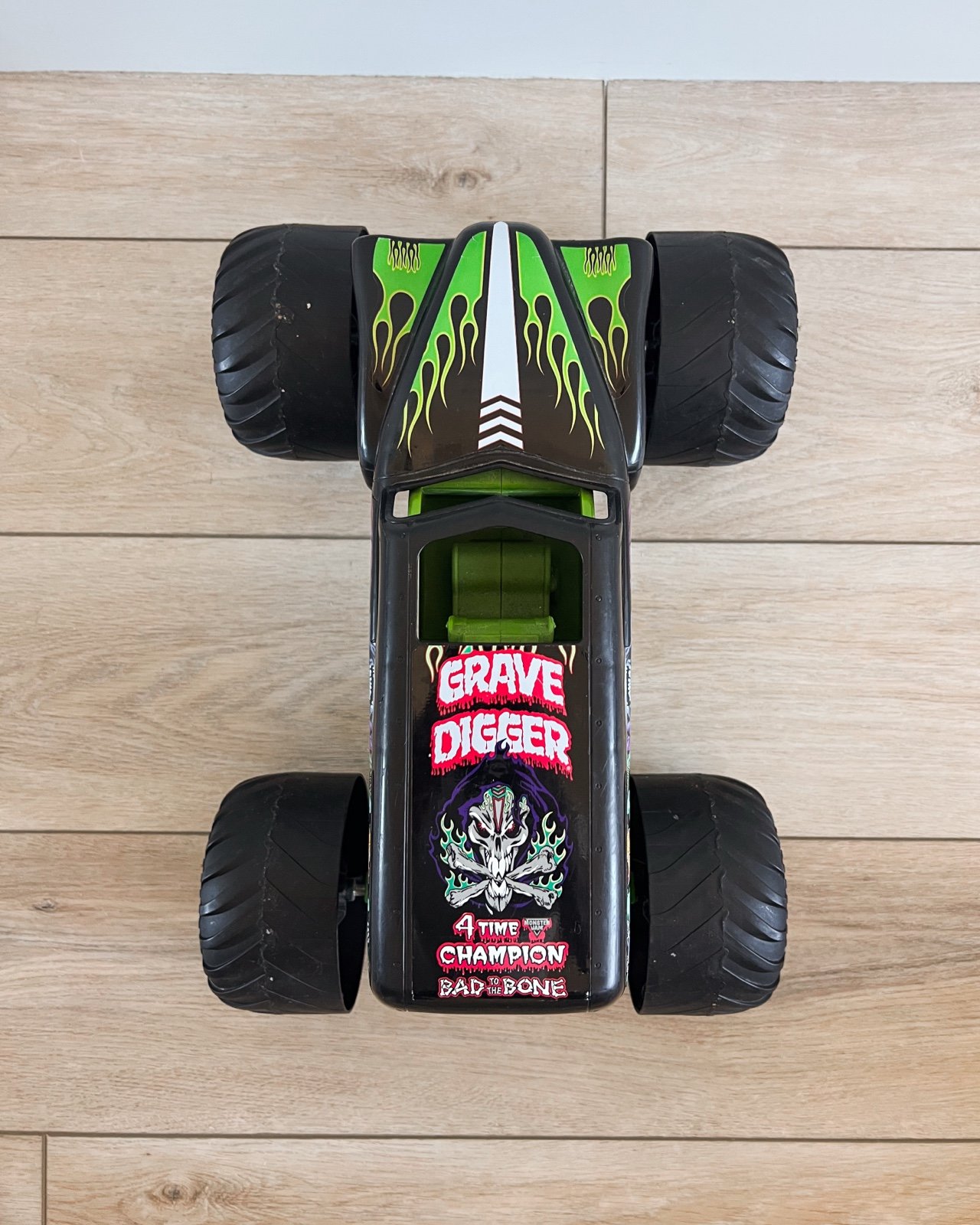 Awsome Hot Wheels Monster Jam Grave Digger Monster Jam toy truck. This thing is so cool and the only one that I've seen in this massive size. Made from plastic with metal springs that actually move. Tires spin with no issues. Comes as shown and ready to add to a collection to toy room.