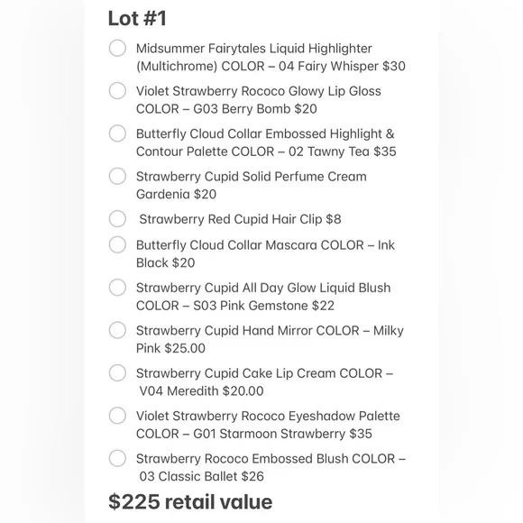 Retail value of $225!All products are brand new and have never been used, plastic wrapping has been taken off to ensure that makeup has no manufacturing errors or has been damaged.Check last photo for list of products of what comes in this bundle.Price is firm since I have already given a discount of 20% off retail value.If this bundle isn't your vibe check out my closet I have 4 more bundles! *coming soon* :)
