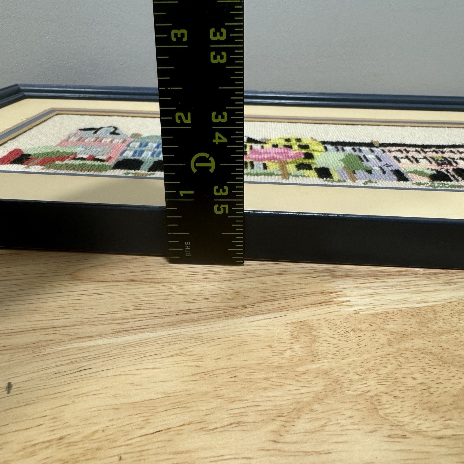 Beautifully crafted framed cross-stitch depicting a colorful row of coastal houses, reminiscent of Charleston's famous Rainbow Row. This piece features vibrant pastel tones, a cream mat with navy trim, and a navy wooden frame. Perfect for adding a pop of color and charm to any wall. Pre-owned with minor wear to the frame — see photos for details and measurements.