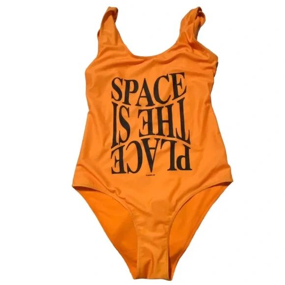 Orange swimsuit with contrasting print that says “Space is the Place.” Size EU 36, fits similar to US XS. No stains or snags. First 2 photos are for modeling visual. Details from retailer below.ITEM INFOStretch recycled nylon jersey one-piece swimsuit in orange featuring text printed in black at front. Supplier color: Bright marigoldBody: 78% recycled polyamide, 22% elastane. Lining: 83% recycled polyamide, 17% elastane.Made in Portugal.