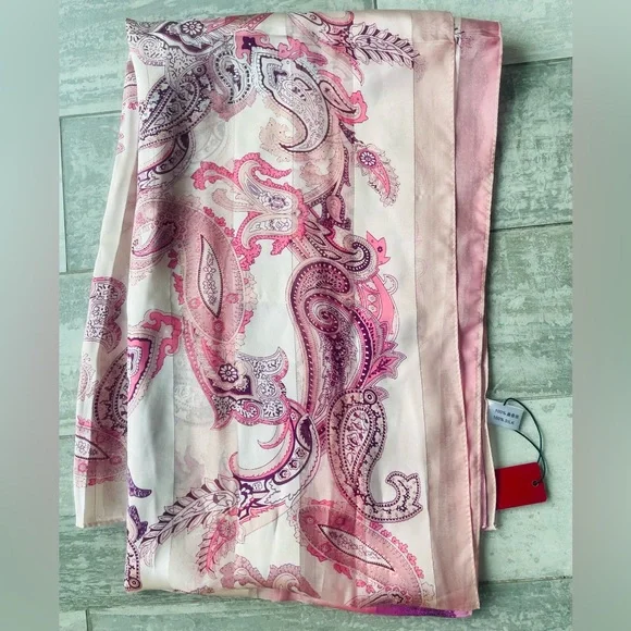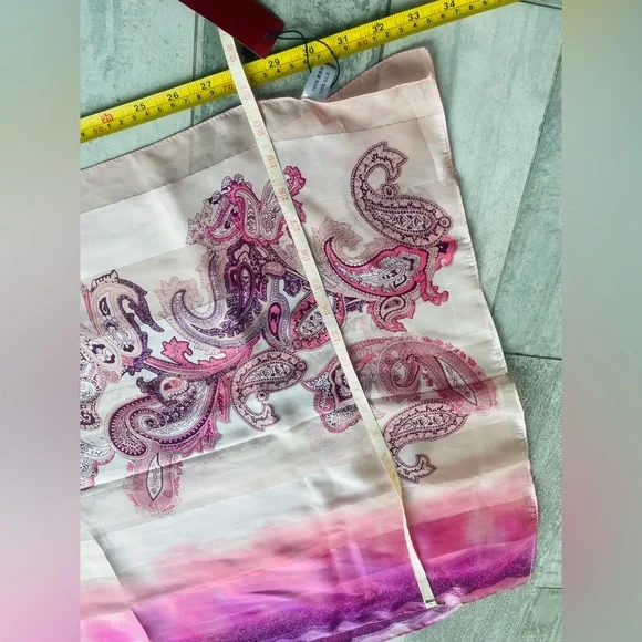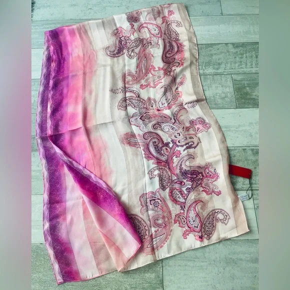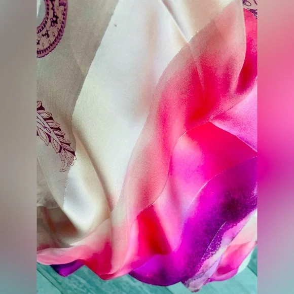 NEW Bright 100% Genuine Silk in Ombre blend of saturated hues of pink purple lavender and beige from historical land of silk - China HandmadeStriped through with silver lining of Lurex threads on a border of every stripeBunched floral theme of paisleys (known as French cucumbers)Alternatively striped silk with satin sheer silver Lurex line amd silk see through alternating textures of silk sheer see through gaze and satin shimmering Stripes Measured in pic, don’t forget to multiply by x2