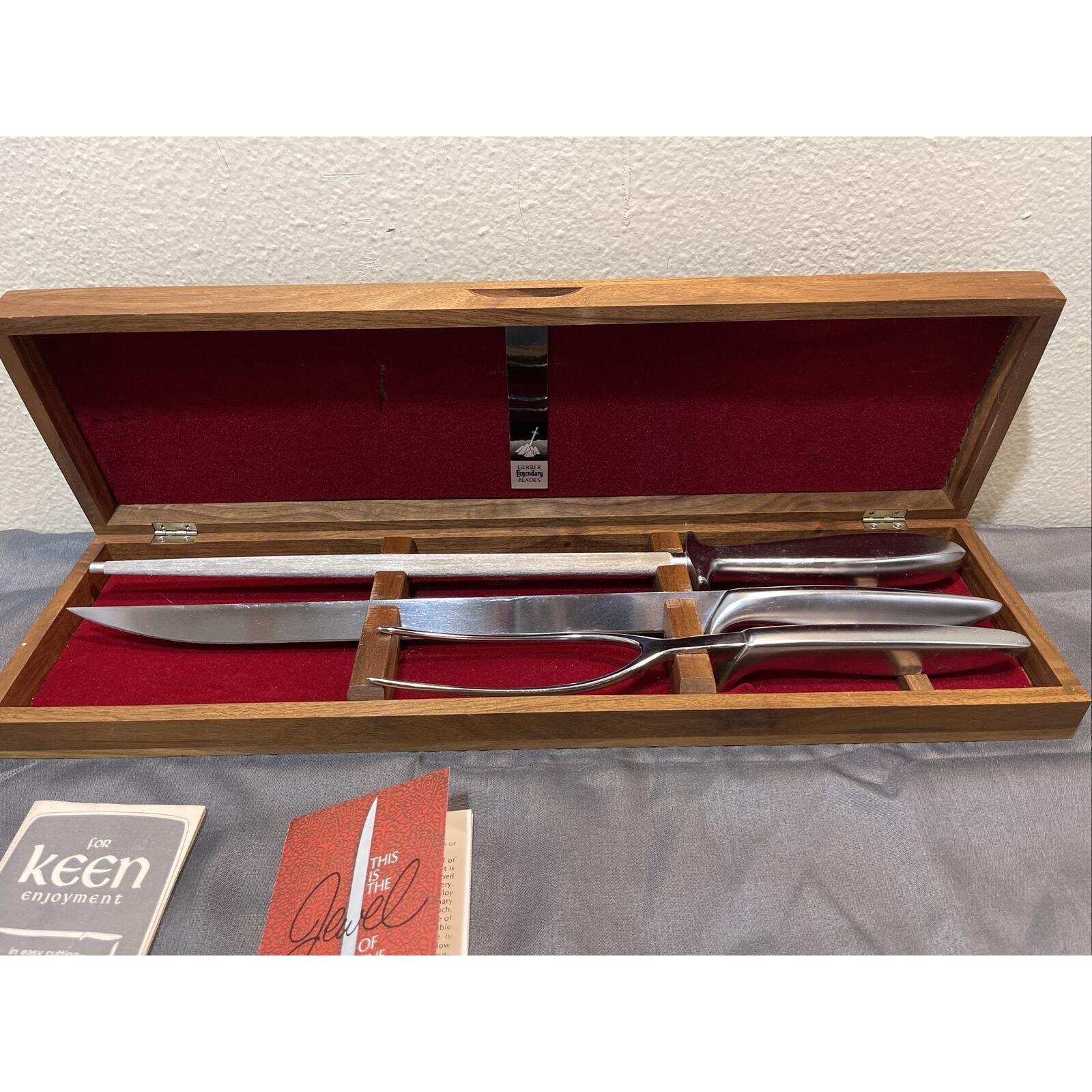 This set includes a knife, fork and a sharpening steel all in the original box. The brand is Gerber and the model is GERBER GUNGNIR. This set falls under the categories of Flatware Sets, Flatware, Knives & Cutlery, Kitchen & Home, and Collectibles. It is a great addition to any collection or for everyday use. The knife is sharp and durable and the fork is perfect for any meal. The sharpening steel ensures that the knife stays in great condition for a long time.