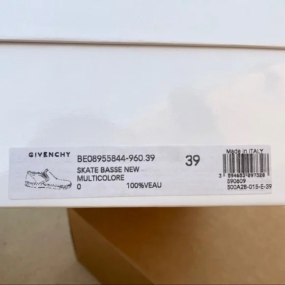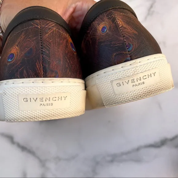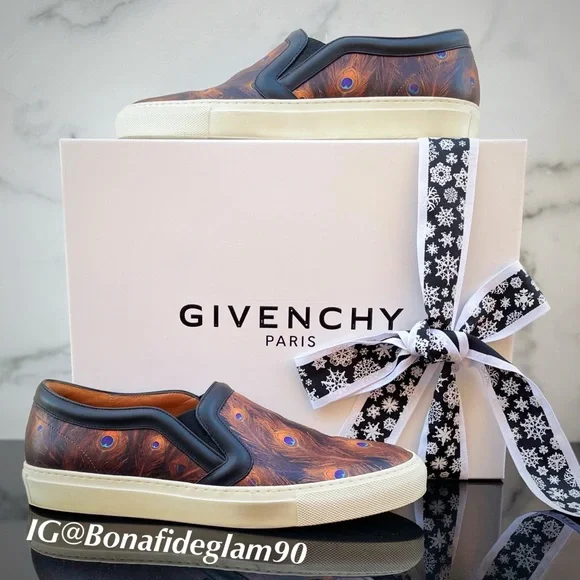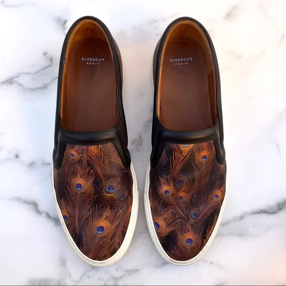 100% authentic Givenchy peacock print skate slip on sneakers, size 39. Besides wear on the soles, these beauties are in flawless condition! Comes with original box.* Givenchy peacock-print calf leather sneaker.* Flat heel.* Round toe.* Side stretch insets.* Contrast leather trim.* Rubber outsole.* Slip-on style.* Made in Italy.