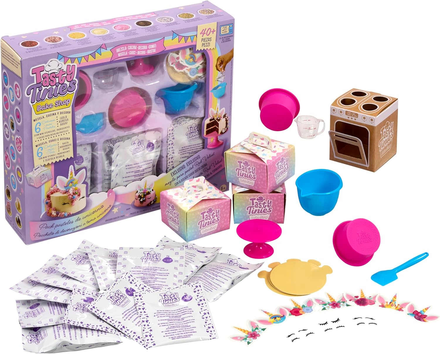 Kit contents: 6 x cake preparations (1 x vanilla/1 strawberry/2 chocolate) 3 x dusting bags 3 x icing packets 1 x quick bake oven 3 x silicone moulds 1 x piping tip 2 x piping bags 1 x mini spatula 1 x mini bowl 1 x measuring cup 1 x pipette 6 x unicorn decorations 1 x Embark cake stand Get on a magical baking journey with the Tasty Tinies Unicorn Birthday Cake Set. This creative kit is designed to allow kids 6 and up to have a magical baking experience in just a few simple steps. Each kit contains everything you need to create six delicious unicorn themed miniature cakes, adding a touch of enchantment to every bite. With only five simple steps, this baking kit is easy to use, even for beginners. Simply mix the cake preparations, pour them into the pans, microwave them, decorate with the included icings and unicorn toppers and enjoy the beautiful creations. The complete kit includes everything you need to create culinary masterpieces: tasty cake preparations, icing bags, unicorn glitter and practical accessories. No more searching for ingredients or tools, everything is included in a handy box. Choose from our different fragrances, vanilla, chocolate or strawberry, for a varied and delicious taste experience. Why not try them all? Make your child's birthday unforgettable by hosting a fun activity where they can create and enjoy their own treats, including cakes decorated with enchanted unicorns."