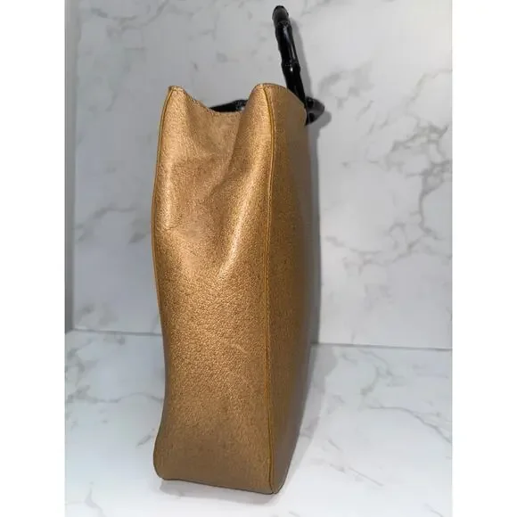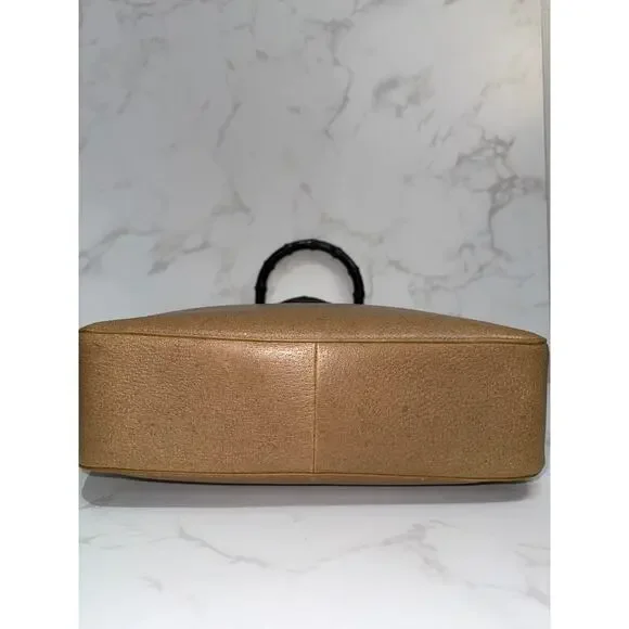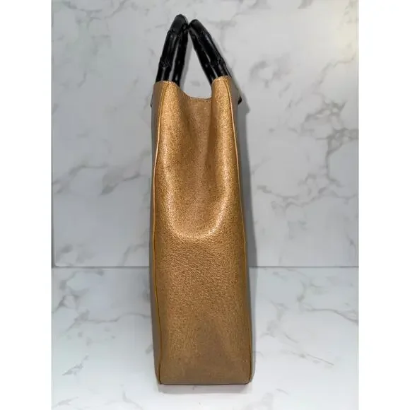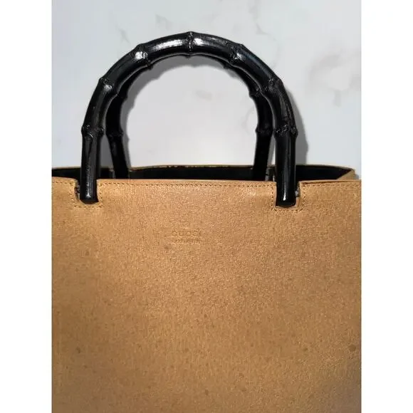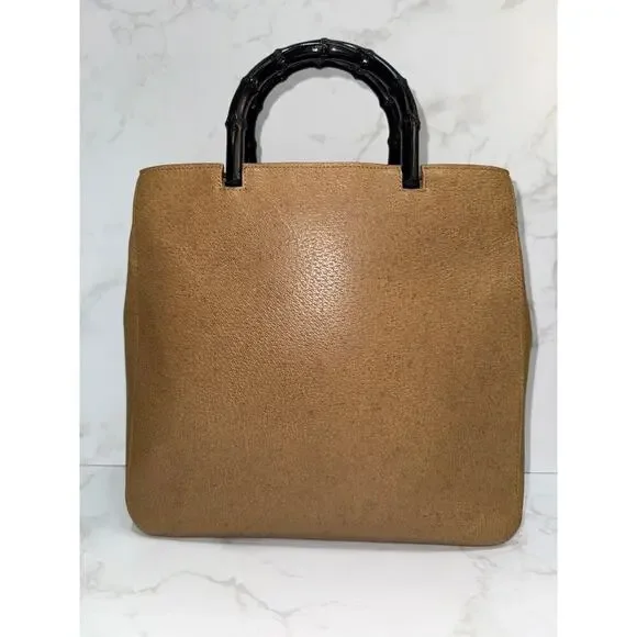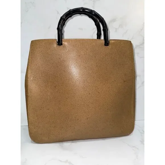 Brand: GucciStyle: Bamboo Handle ToteColor: Tan/Camel leather with black bamboo handlesMaterial: Textured leather, bambooHardware: Black bambooDimensions: 28"W x 23"H x 7.5"DCondition: ExcellentFeatures original black bamboo handlesIncludes: Original dust bag (glimpsed in interior)This classic vintage Gucci tote showcases timeless design elements including the iconic bamboo handles in black and structured tan leather body. The spacious interior is lined in black fabric with compartments for organization. While the bag shows some signs of age consistent with vintage pieces, it maintains its elegant silhouette and practical functionality. The combination of the neutral leather with the distinctive bamboo handles creates a sophisticated look characteristic of Gucci's heritage design.