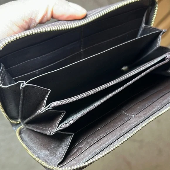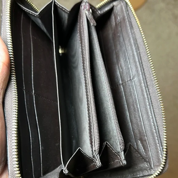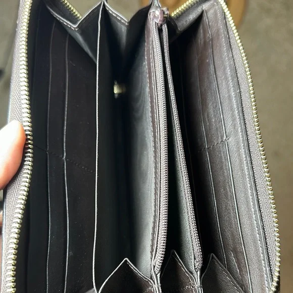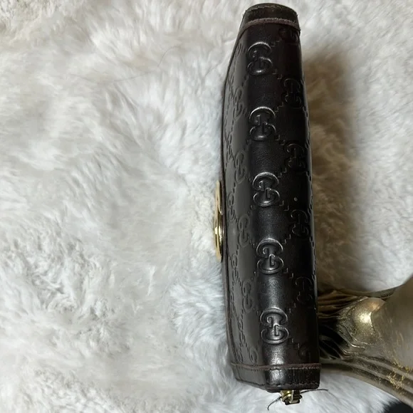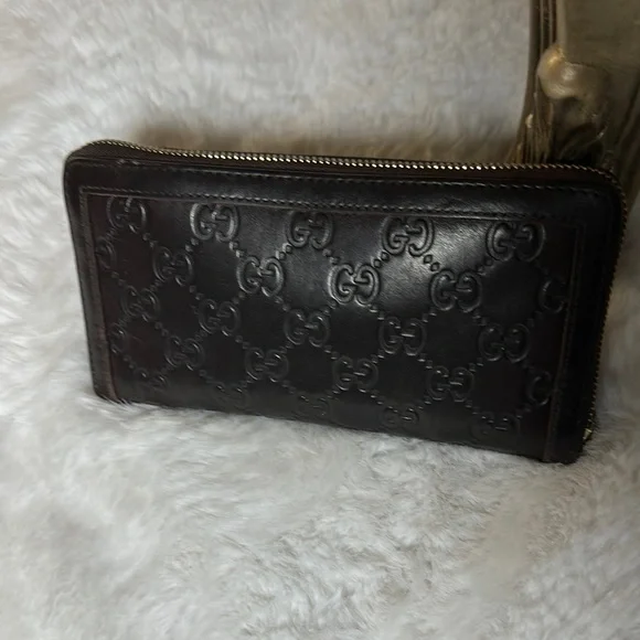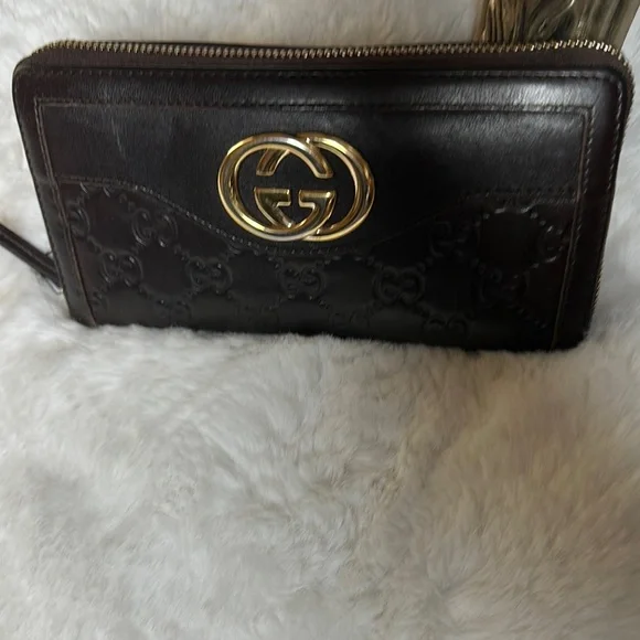 This luxurious Gucci wallet showcases the iconic GG monogram embossed in rich black leather, exuding sophistication and style. The gold-tone interlocking GG logo adds a touch of elegance, making it a perfect accessory for any occasion. Its zip-around design ensures secure storage while maintaining a sleek and modern look. It is in very good condition.