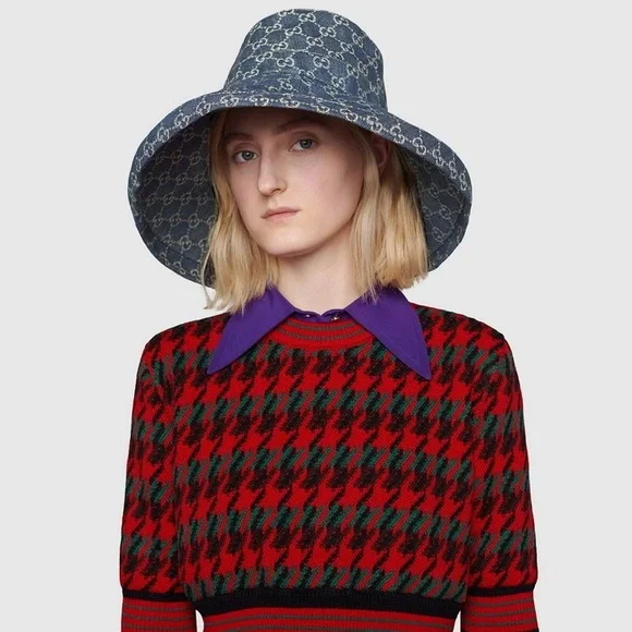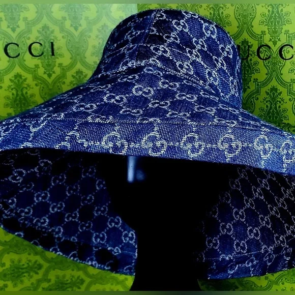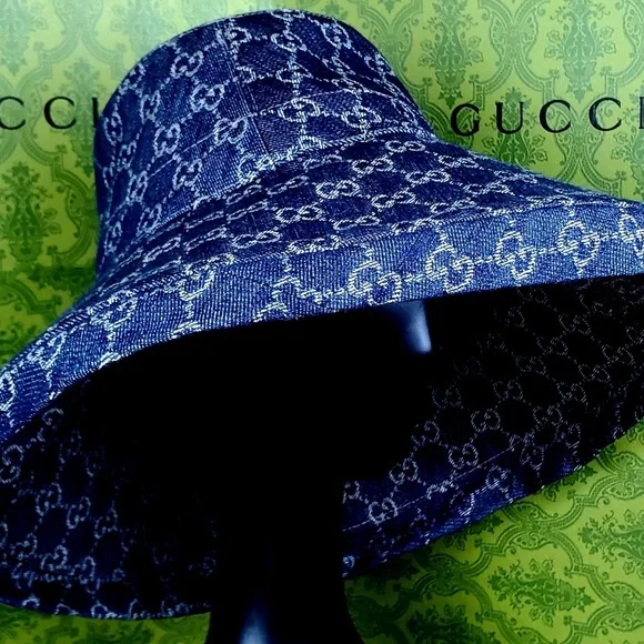 Gucci GG Large Wide Brim Canvas Denim Monogram Jacquard Beach Bucket Hat Seasonal Limited edition Made in Italy Wide BrimGucci's hats will see you through many summers and vacations thanks to how timeless (and cool) they are. Designed with a wide, exaggerated brim, this structured bucket style is made from monogrammed canvas-jacquard and has a breathable denim and linen-blend lining. Match your jewelry to the gold logo plaque.Paying homage to the Founder of the brand, Guccio Gucci, the avant-gardepiece is crafted from GG denim and further enriched by a miniature version of the Double G.Gucci Exclusive GG Thick Stiff DenimCotton-blend Canvas Beach HatColor: DenimDouble Gold-tone Logo Hardware Made in ItalyBody: 66% polyester, 17% cotton, 17% polyamide. Trim: 50% cotton, 50% viscose. Lining: 64% cotton, 36% linen.100% AuthenticCondition: NewSize: US 7 1/4, Fitting up to 59cm