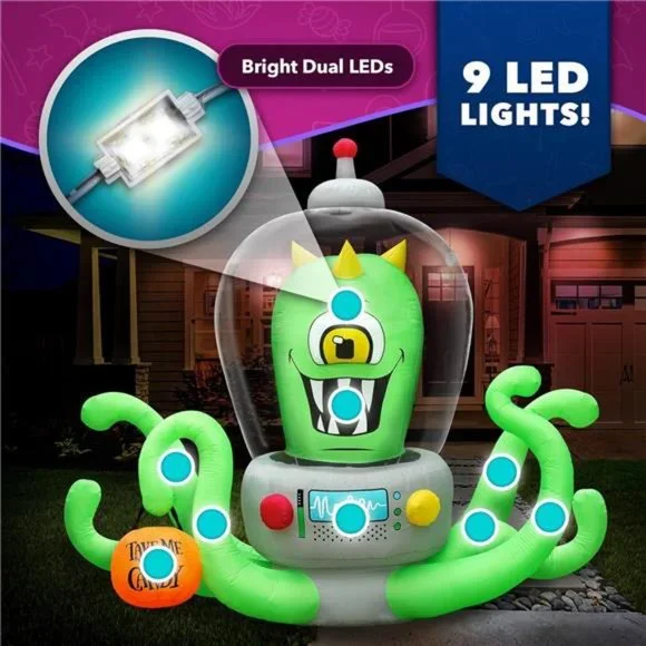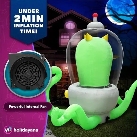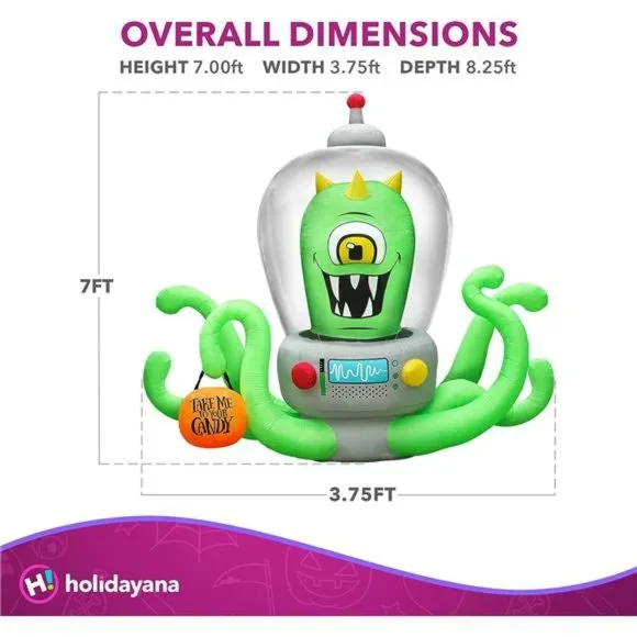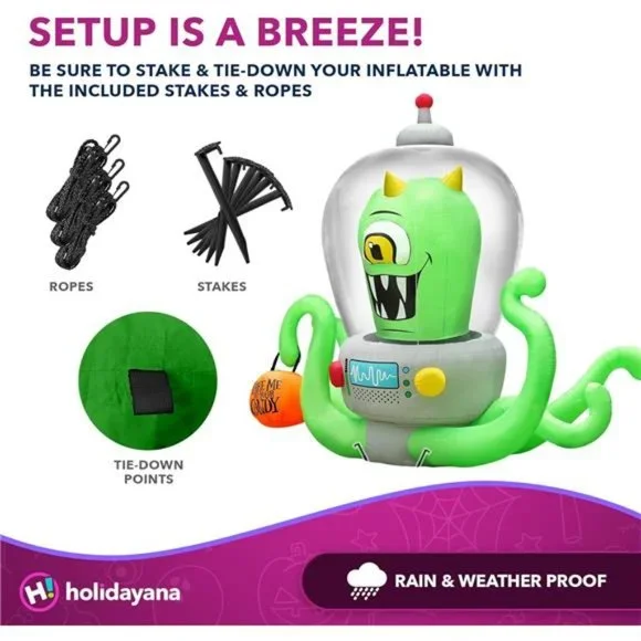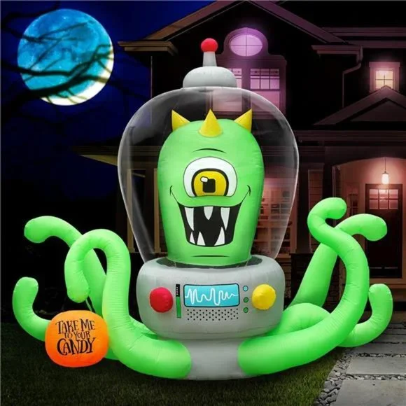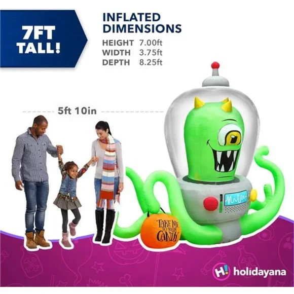 🧿MASSIVE INFLATABLE HALLOWEEN DECORATIONS: Standing impressively at 7 ft tall when fully inflated, this large Trick or Treating Alien Inflatable will ensure you have one of the biggest & spookiest Halloween blow up yard decorations in your neighborhood!🧿LIGHTED HALLOWEEN DECORATIONS OUTDOOR: This Inflatable Trick or Treating Alien will light up your yard, lawn or garden on the spookiest night of the year! Super bright built-in LED light bulbs create a bewitching nighttime display🧿POWERFUL FAN: Set up your haunted house or graveyard display in no time withblow up halloween decorations. These giant Halloween inflatables outdoor decorations have powerful external waterproof fan for super fast inflation!🧿SECURE SETUP: Our Halloween InflatableCat with Trick or Treating Alien is the perfect indoor or outdoor decor this fall.cute & scary Halloween blow ups come with tie-downs, stakes & ropes to fasten securely in place as you welcome guests or trick-or-treaters🧿COMPLETE PACKAGE: Allinflatables include everything you need to set up your inflatable right out of the box within minutes! Start your collection of yard decorations that will last for many more Halloweens to come!