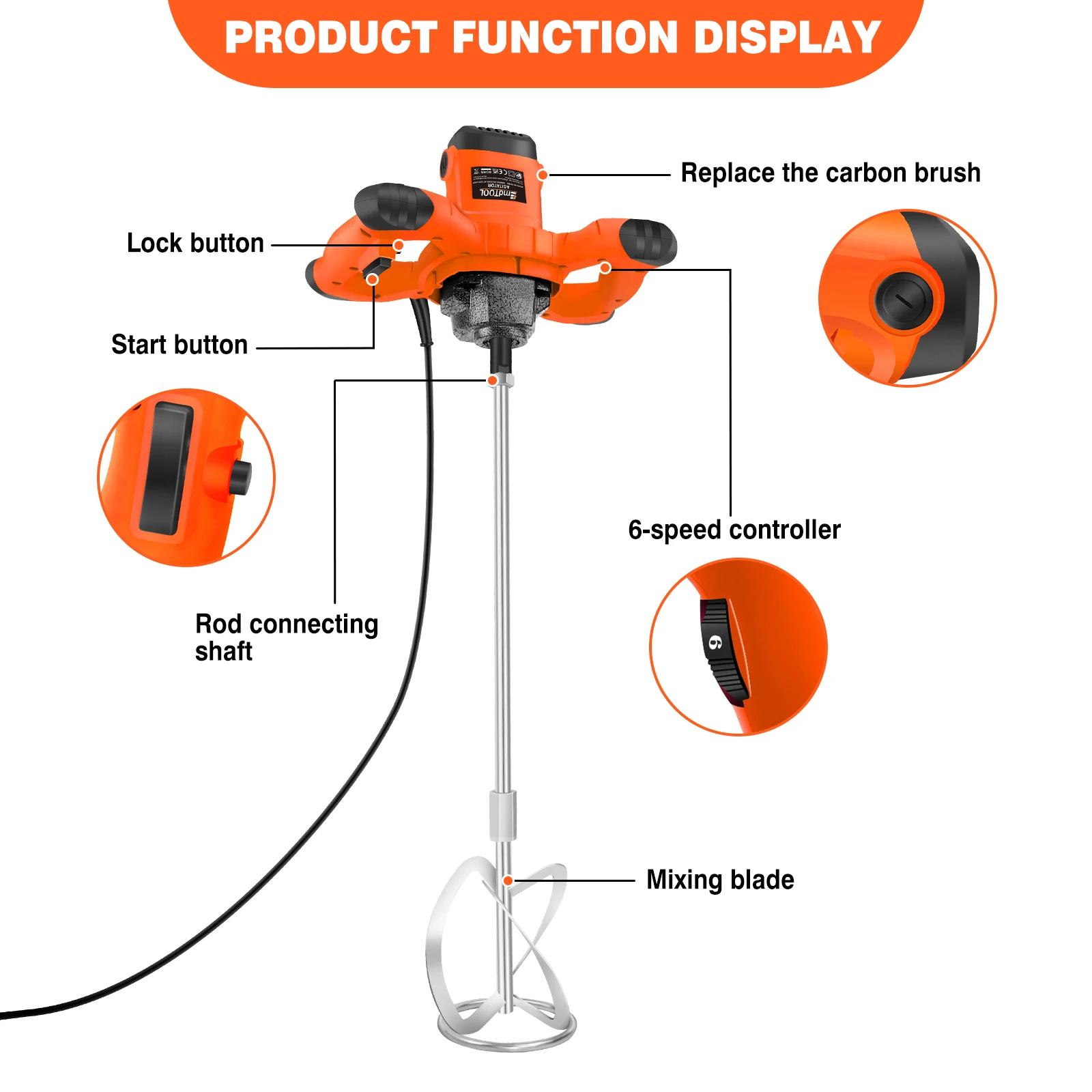 6 Variable Speed: The concrete mixer has 6 gears adjustable to handle various materials evenly to avoid splashing of the stirred materials due to excessive speed. With a self-locking switch to ensure the safe use of users.
