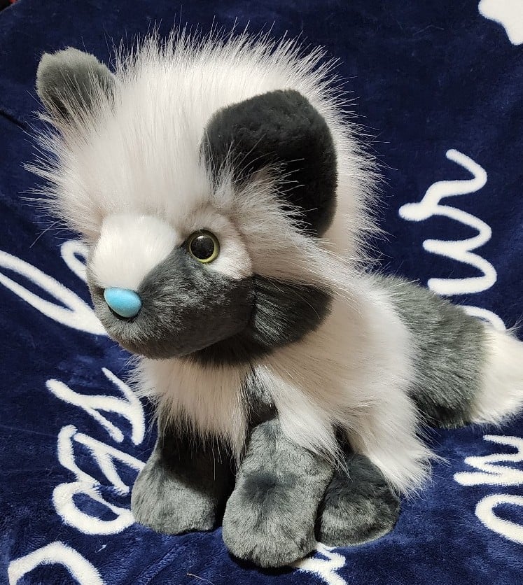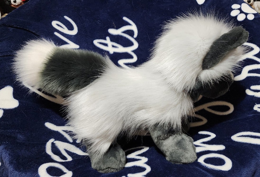 This plush was 100% handsewn and made by me and pattern is by whittykittyplushies but I heavily edited it! This fox is inspired by the blue nose friends silver fox george, and measures about 17in long and stand 13in tall, super floppy/posable, and lightly weighted in his feet!