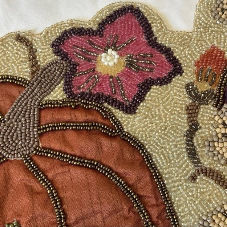 Heavy Pier 1 Fall Harvest Pumpkin Beaded Table Runner is a festive and decorative piece perfect for celebrating Thanksgiving or Halloween. Made of 100% polyester, this rectangular table runner features a pumpkin pattern with embroidered detailing and colorful beads. With a traditional style and a fall theme, this multipurpose item adds a touch of charm to your dining table. Hand wash only to preserve its quality, this table runner is 36 inches wide and ideal for gatherings and holiday celebrations.