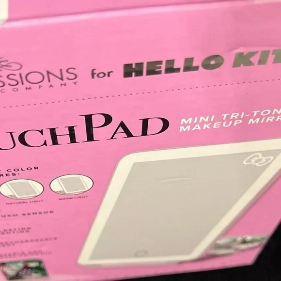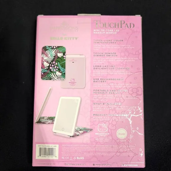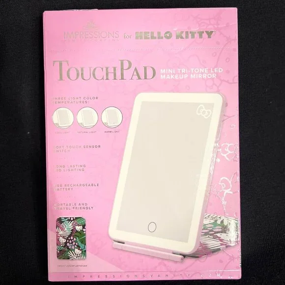 Brand new in box HELLO KITTY (ANIMAL) TOUCH PAD MINI TRI-TONE LED MAKEUP MIRROR!Touching up just got supercute with the Hello Kitty Touch Pad Mini, super-slim, micro-USB rechargeable LED travel mirror. Consistent lighting with a dimmable LED light strip, the Hello Kitty Touch Pad Mini Tri-Tone LED Makeup Mirror provides all of your get-ready-glam needs. Designed with a tropical animal Hello Kitty print, this mirror is unlike any other. The user-friendly folio cover protects the quality of the mirror and also serves as a base stand.Features:Protective flip coverSuper slimPortable and travel-friendly designTouch sensor dimmer switchUSB Rechargeable BatteryLong-lasting daylight LED LightingThree light color temperatures: cool light, natural light, warm light