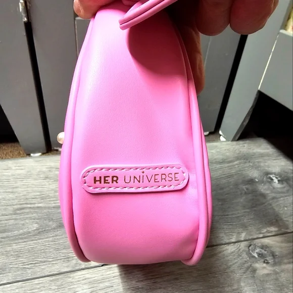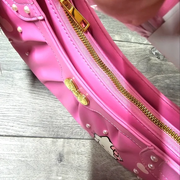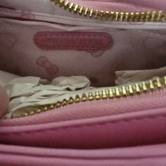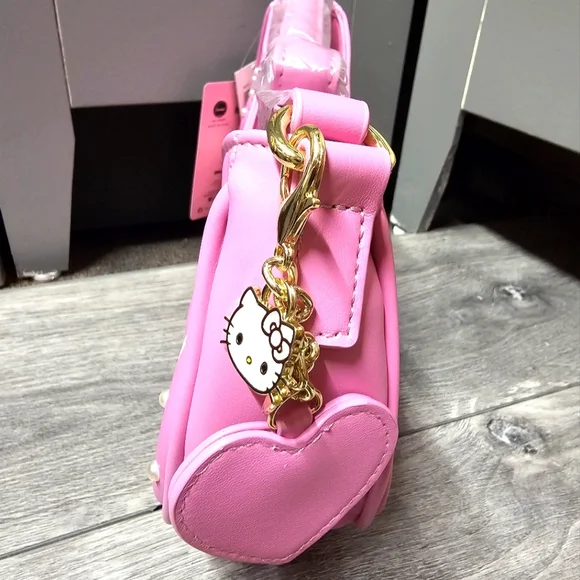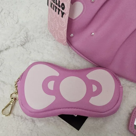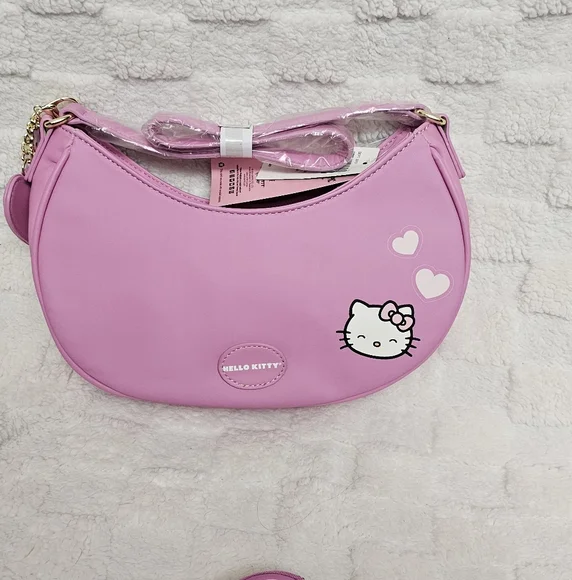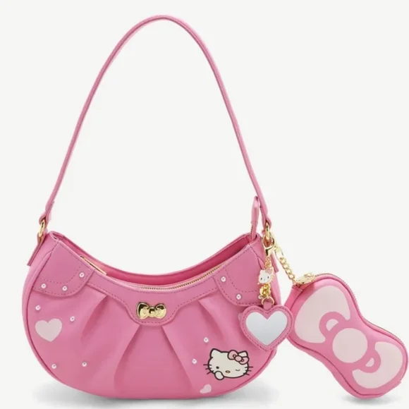 Hello Kitty Pink Baguette Her Universe Hello Kitty Pink Heart Baguette PurseKeep ot Pink and Kawaii with Hello Kitty! This bag has hearts and pearlescent beads all over, and a winking hello kitty printed at the cornerThere's also a keychain with a heart mirror and Hello Kitty charm, plus Heart Bow embossed at the center Interior drop pocket Zip top closure Product Details 11' × 7' inchesInterior drop pocketRemovable mirror and charm keychainImported Her Universe Hello Kitty Pink Bow Coin Purse This coin purse is shaped like Hello Kittys iconic bow in pink ,comes with a swiveling hook and a Hello Kitty charm.6" × 3"Polyurethane Hook and charm included .Packaged with love and from a smoke-free environment ❤️