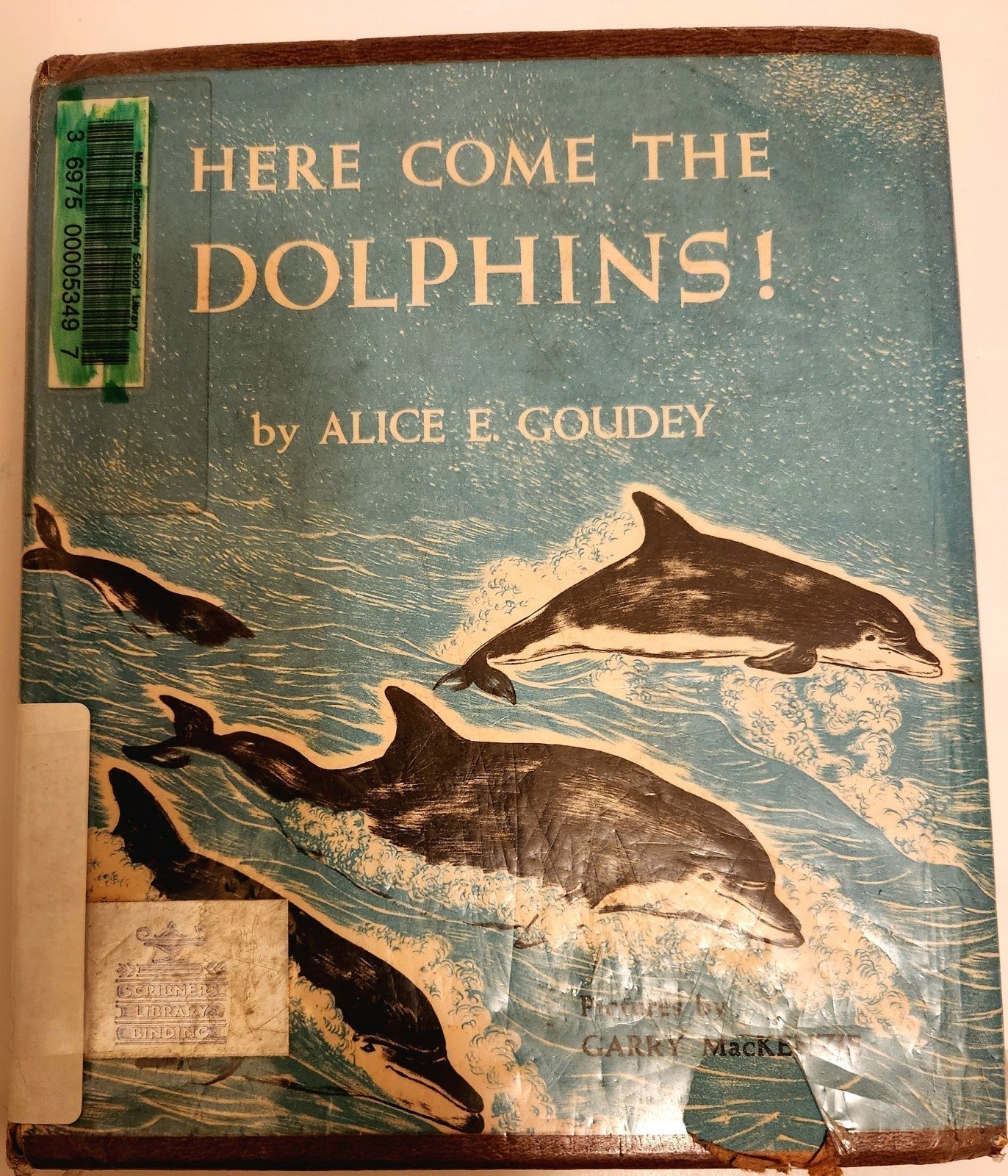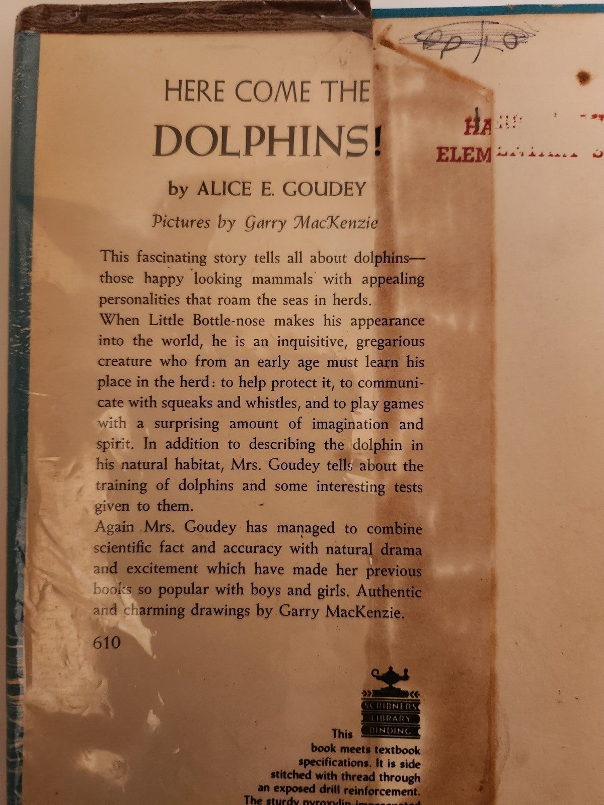 of Here Comes the Dolphins by Alice E. Goudey and pictures by Garry MacKenzie copyright 1961. This is one of Goudey's nature books. This item does show signs of age/wear/use. There are a few pencil marks and the library card holder on the inside covers, there is also a little discoloration on inside covers from the glue of the dust jacket. The pages are intact and the pictures beautiful.**(please see all pictures for details and condition of this item as this item is used and vintage)**