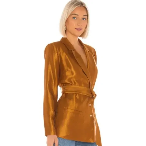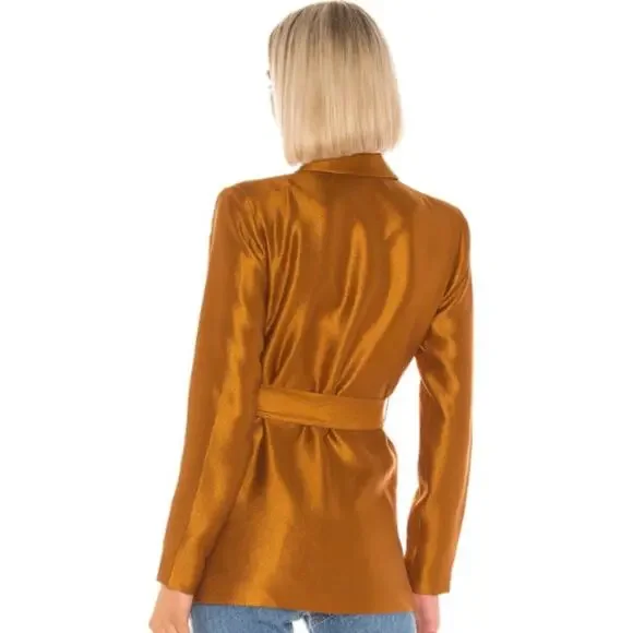 House of Harlow 1960 X REVOLVE Adra Jacket in Gold NWT Size Small Self: 68% cotton, 32% poly.Lining: 100% poly. Hand wash cold. Satin fabric. Front button and belted waist closure. Welt pockets. Padded shoulders. Sold Out OnlineImported. Revolve Style No. HOOF-WO121. Manufacturer Style No. HHOW8 F19.