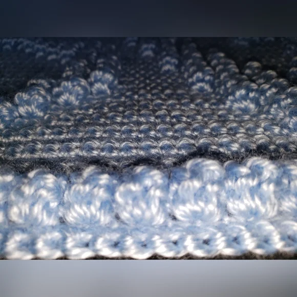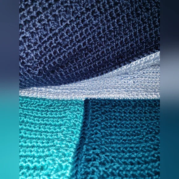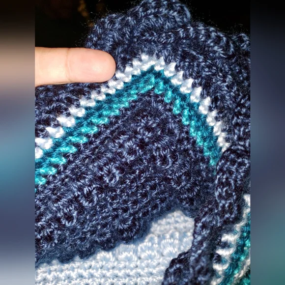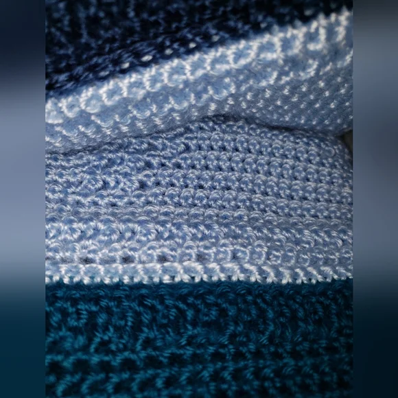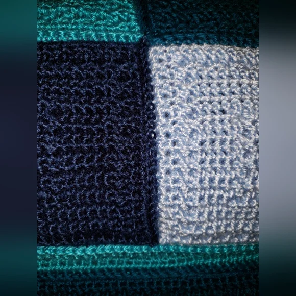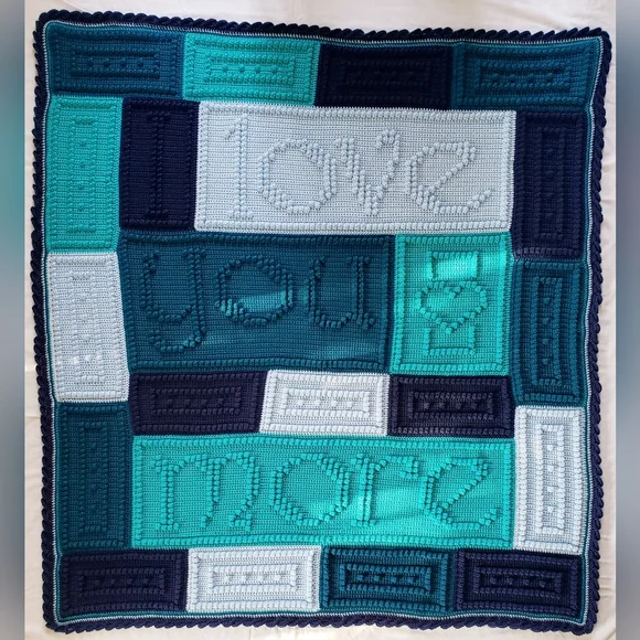 I crocheted this absolutely beautiful afghan using Navy Blue, Teal, Ice Blue, Turquoise. It's a wordghan with the words "I love you more" created with a popcorn stitch. I put a wave border on it using the navy blue to give it a nice finish. The yarn is 100% Acrylic yarn Soft and Shiny by Loops and Threads with the exception of the teal which is Red Heart Soft. This blanket is very very soft!!I take special care to leave my tails long and weave them in good. I do my best at making sure they never come undone and will last years to come. The pattern is called "More" by Jody Pyott.The first photo is the finishedafghan and what you will receive. I've also shared photos during the process of making this blanket. It's extremely hard to get a perfect picture on these afghans but I do my best to make my edges straight, even though the pictures may look a little off.Size 59" length x 54" widthAll my handmade items come from a smoke free environment. I put between $80-90 worth of yarn into each blanket.Care Instructions: Machine wash warm, gentle cycle. Tumble dry low heat. Do Not overdry. Do Not iron. Do Not bleach. Can professional dry clean if preferred.