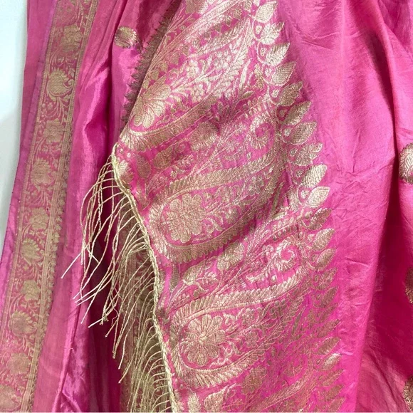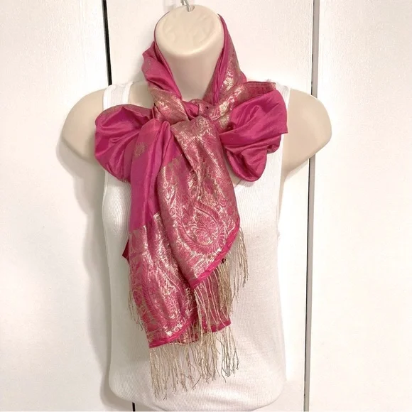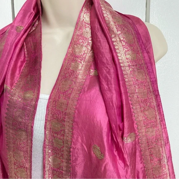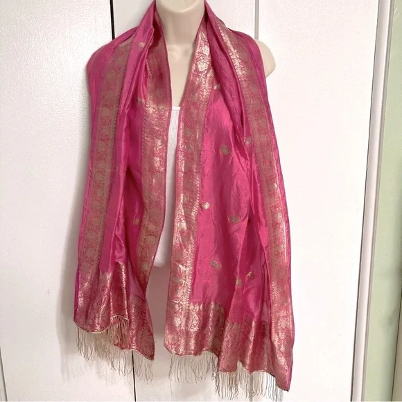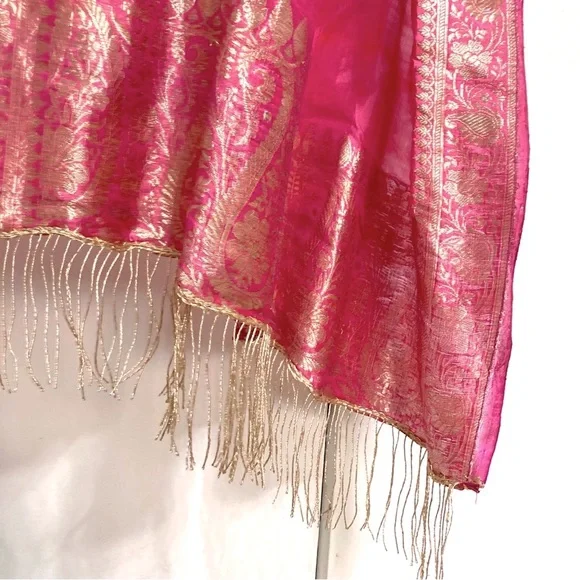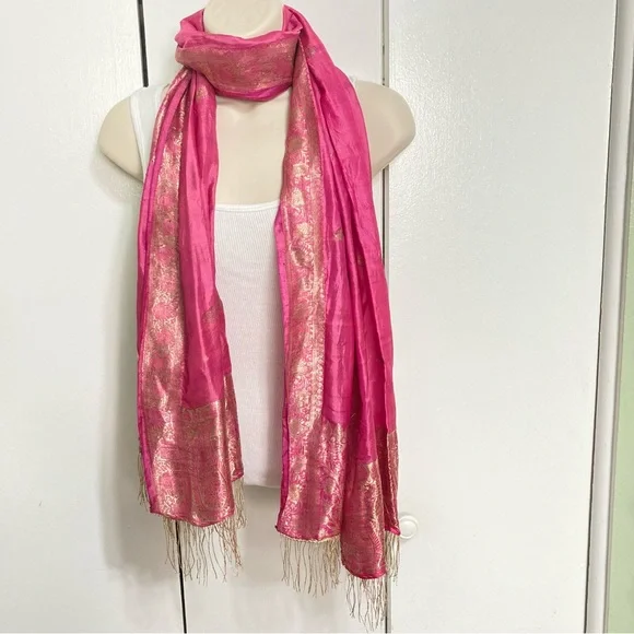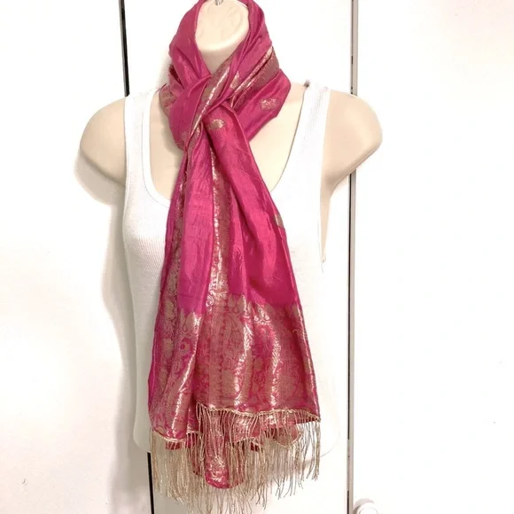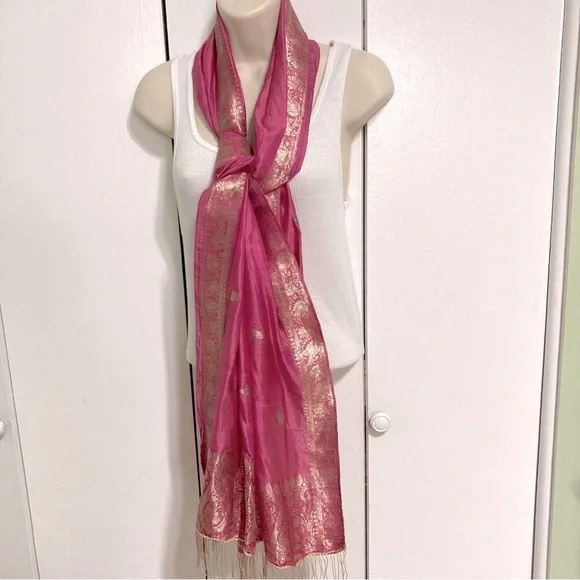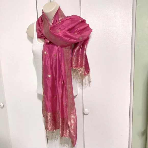 Party Wear Indian Scarf Foil Sewn Bright Shiny Pink Wrap Scarf Tie 33" x 20"Foil Sewn Embroidered Design throughoutFancy Classy Special Occasion Wrap33" Long, Fringe 2.5" Long, 20" WideStunning Pink Dupatta with Gold Weave Designs is the perfect elegant touch to your Indian suits or lehengas*Please see pics for details* No rips, stains or damage noted. Clean and in Excellent Condition.Fast Shipping-Accept Reasonable Offers- Smoke free home- When you buy multiple items in a bundle, you get a bundle discount & only pay 1 shipping fee :)Questions? Leave a comment below!Thank you for Supporting my Woman, Minority, Veteran Owned business :)#Scarf, Neckerchief, kerchief, hankie, handkerchief, bandanna, babushka bandanna, shawl, veil, mascada, handkercher, necker#