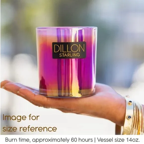 Iridescent scented candle Dillon Candles Starling -Succulent Grapefruit Gift BoxOur Birds of a Feather collection pays homage to the beauty of our finely feathered friends:We created vessels that mirror the natural iridescences of their plumage bringing color and light into your home, the engraved leather label adds a touch of luxury and elegance. Extra large in size. Boldly Scented | Clean burning Coconut wax blend | Individually hand poured to order:Burn time approximately 60 hours | Vessel size 14oz. | Size: 3.5" x 4"#scentedcandle#iridescent#luxurycandle#extralarge#oversized#grapefruit#wedding#bridesmaid100624