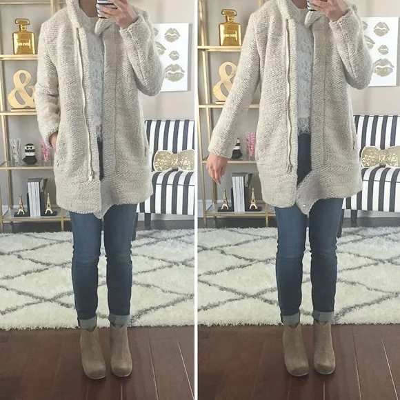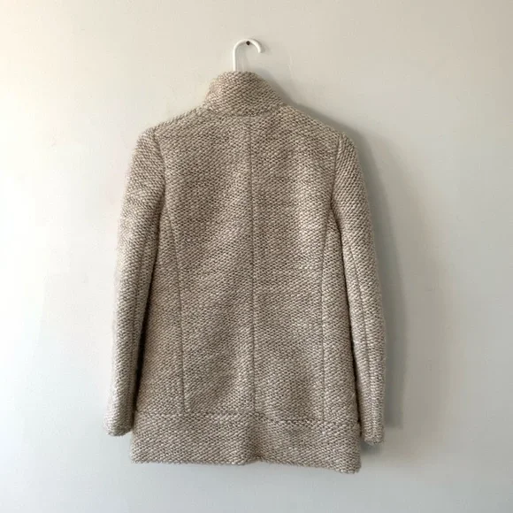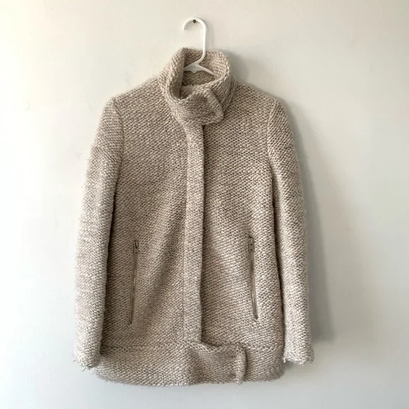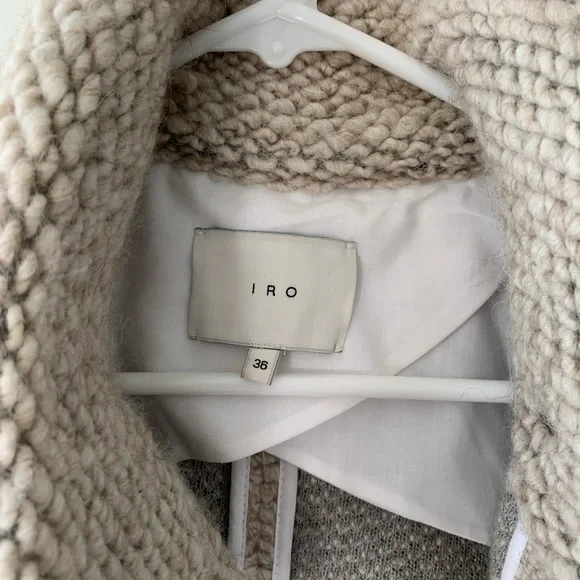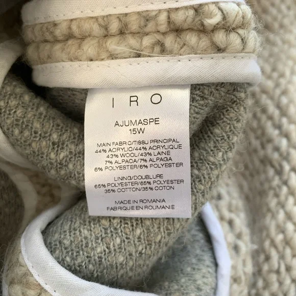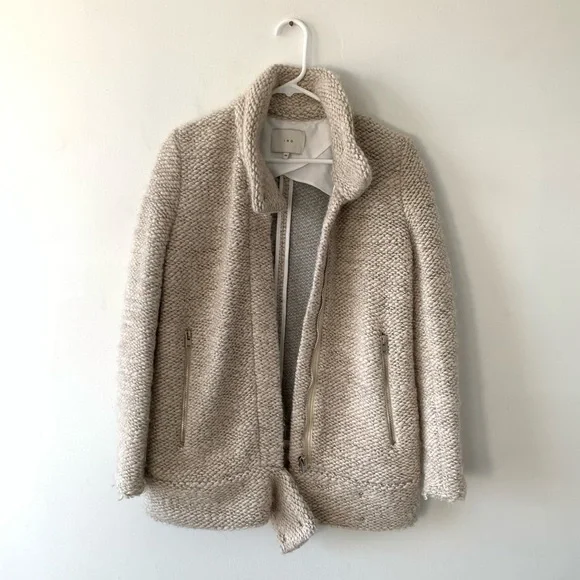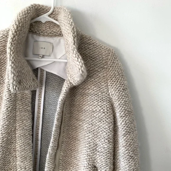 IRO Ajuma jacketSize 36 FR, equal to US size smallIn excellent preowned condition, no flaws The perfect marriage of biker chic and winter-weather cozy, this neutral-hued jacket is knit from sumptuous alpaca-kissed yarns and topped with a high moto-inspired snap collar.28" length Front zip closure with snaps at collar and hem.Side-seam zip pockets.Unlined.44% acrylic, 43% wool, 7% alpaca, 6% polyester.Dry clean.By IRO; made in Romania.