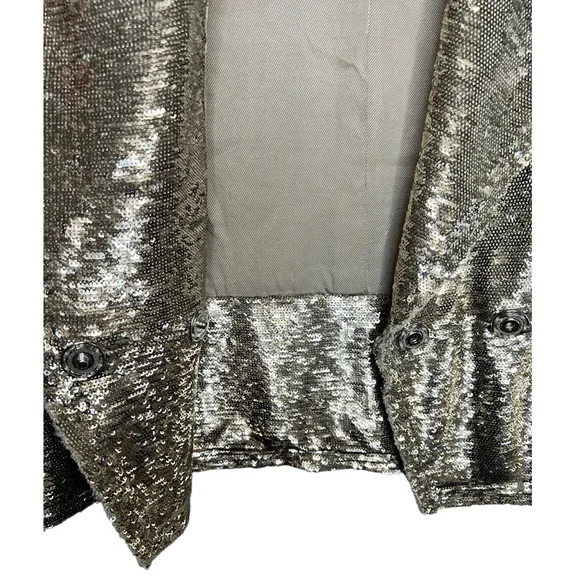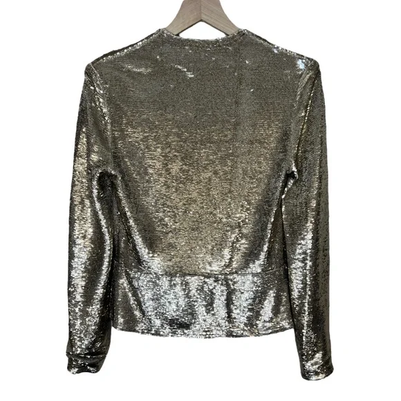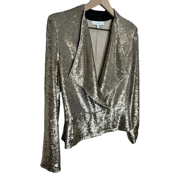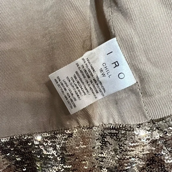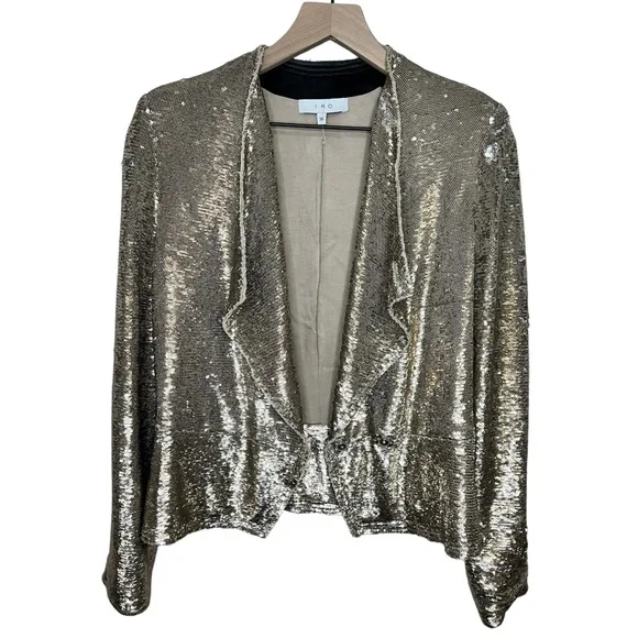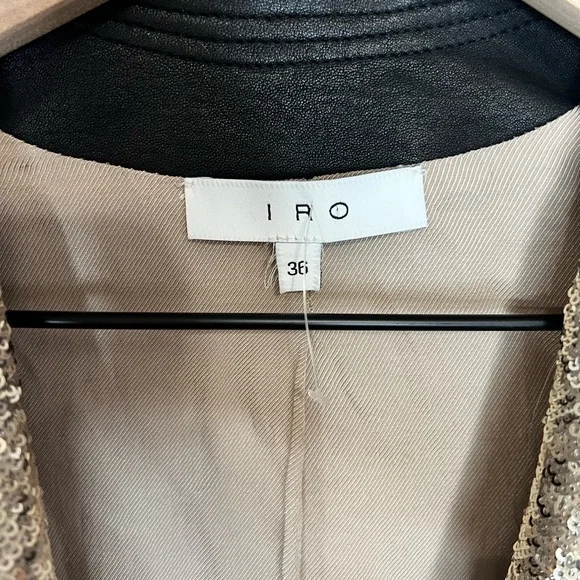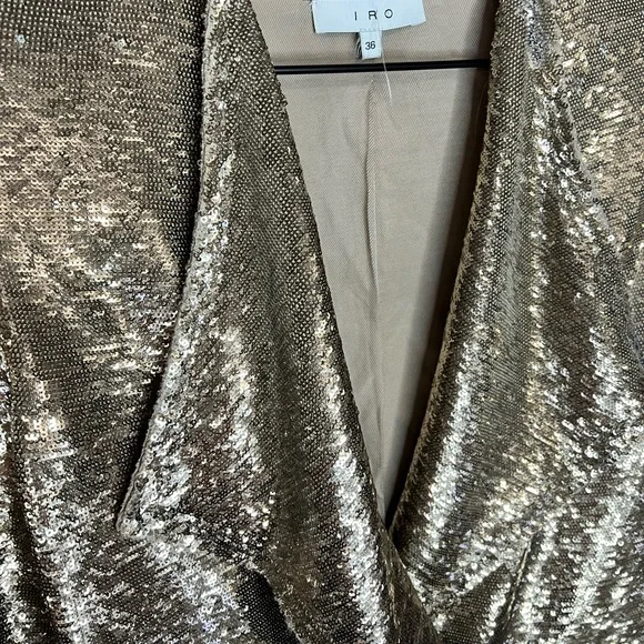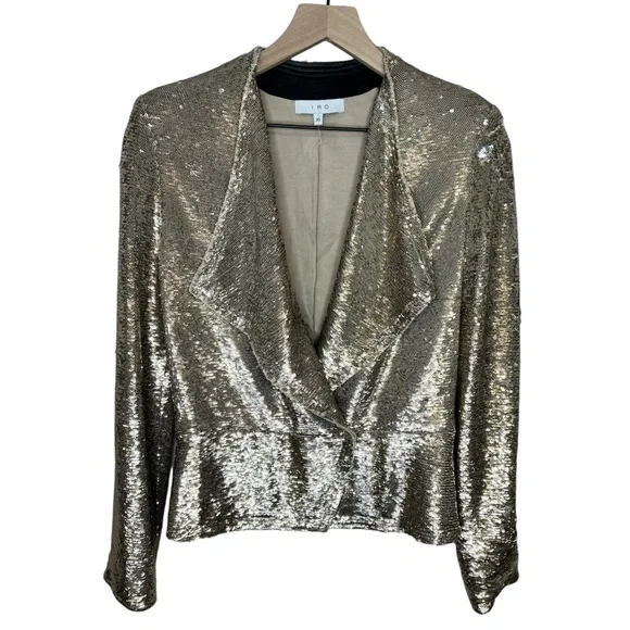 IRO Chill Sequin Double-Breasted Jacket GoldIRO "Chill" jacket in sequins.Winged collar; hidden double-breasted front.Long sleeves.Fitted silhouette.Straight hem.Color: Gold Material: Polyester/rayon/spandexSize: 36 US 4 Measurements Approx.: Across Chest 19in, Length 22in, Across waist buttons 16inCondition: EUC.It’s so beautifully sparkly :)Comes from a Smoke free pet friendly home.