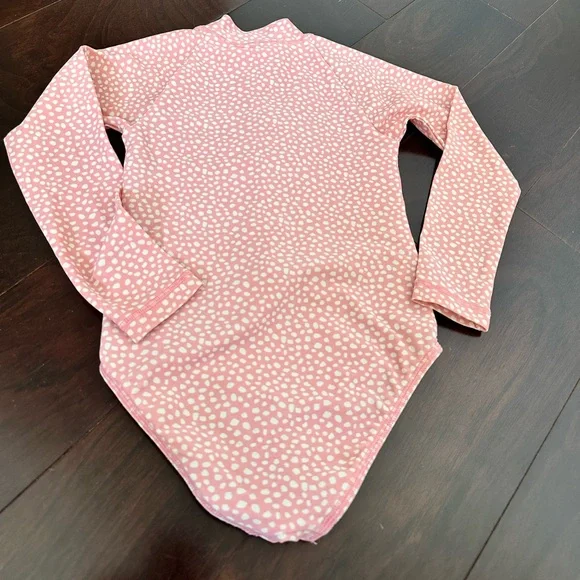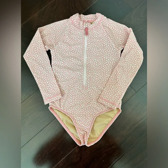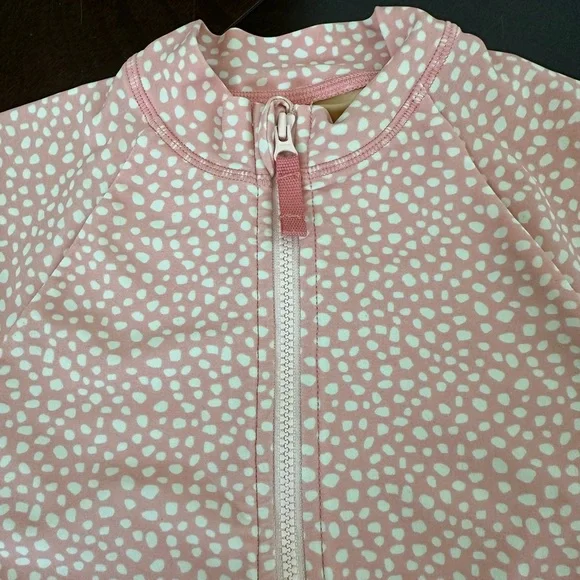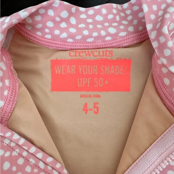 J Crew Girls one piece rashguard in pink rocks, UPF50+, size 4-5This rash guard one-piece is as easy as it gets, thanks to a zip-up closure and higher neckline for extra coverage. Plus, it's made with built-in UPF 50+ sun protection (think of it as SPF for clothes, although they should still apply sunblock too).Excellent condition. (No stains or tears)