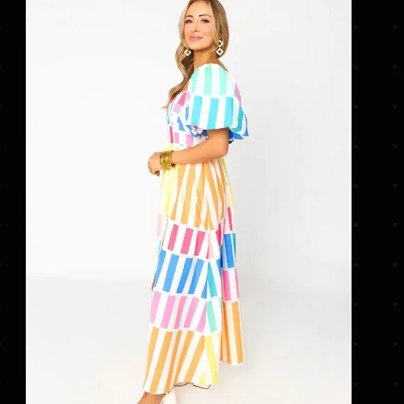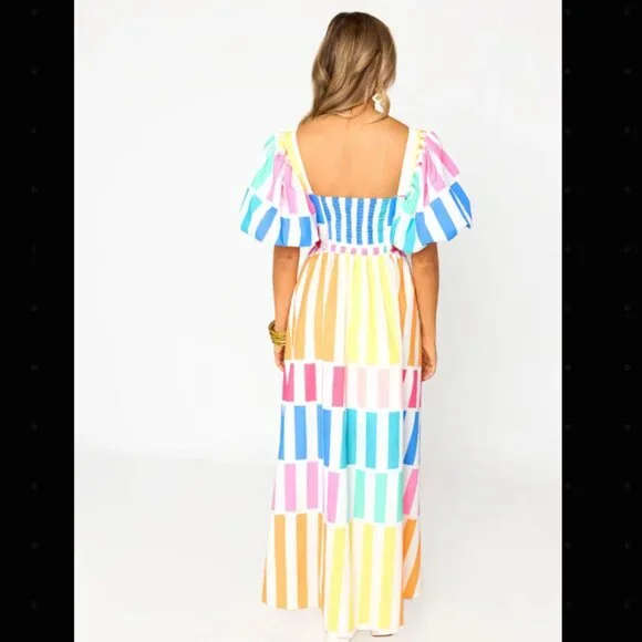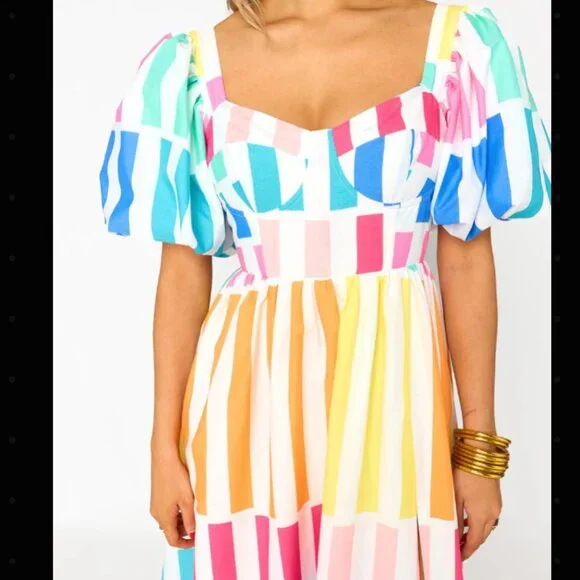 Our Jacqueline Dress is THE dress for your summer! She features a sweetheart neckline, smocked back panel, and short sleeves with a puffy silhouette, and a slit on the left leg to mid thigh for added flare. * Fit: The Jacquline dress fits true to size.* Length: Midi length - falls right above the ankle* Bust: Fitted - Smocked backing allows stretch* Waist: Relaxed fit.* Fabric: Fabric contains no stretch.* Material: Self-100% Cotton, Lining-100% Rayon