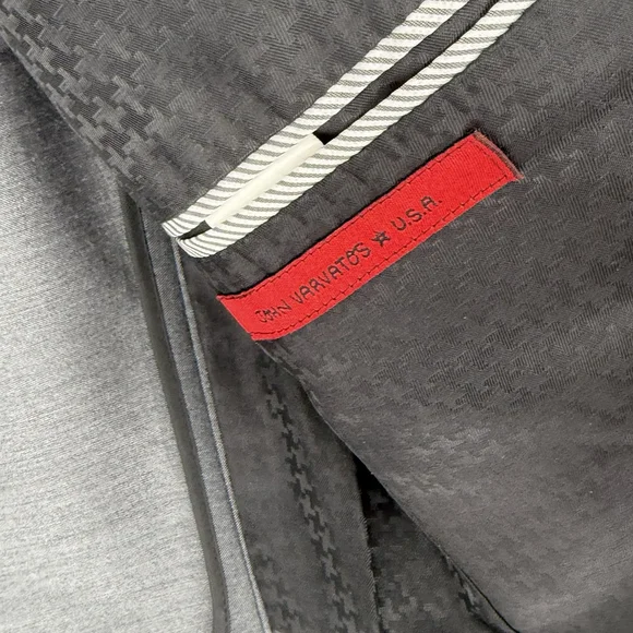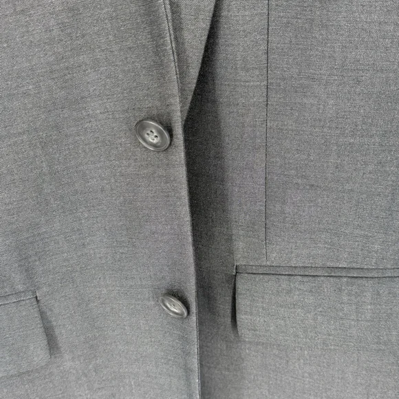 This is a John Varvatos USA Men's Blazer in a stylish gray color with a regular fit. It features a two-button front closure, four-button sleeve design, and a double-vented back. Made of polyester and rayon, this blazer is suitable for casual, formal, or business occasions, and is designed in the USA. The size available is 40R, with a chest size of 40 inches.