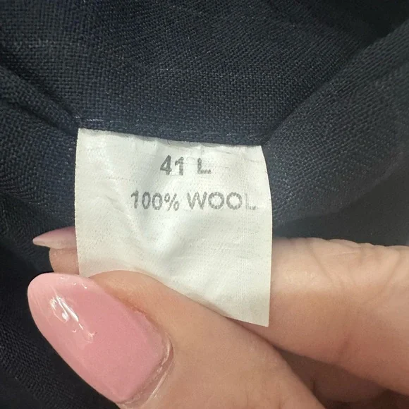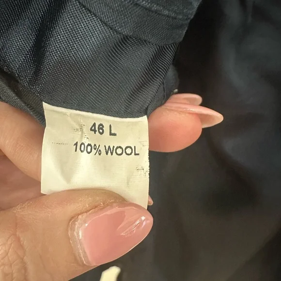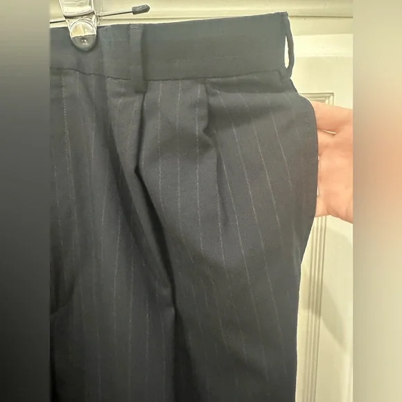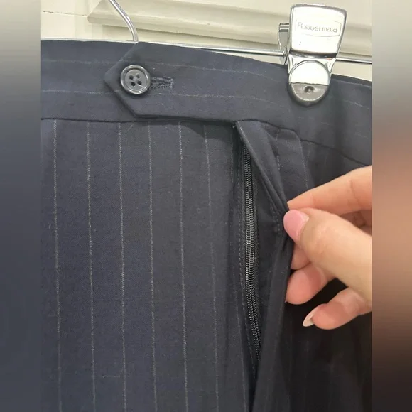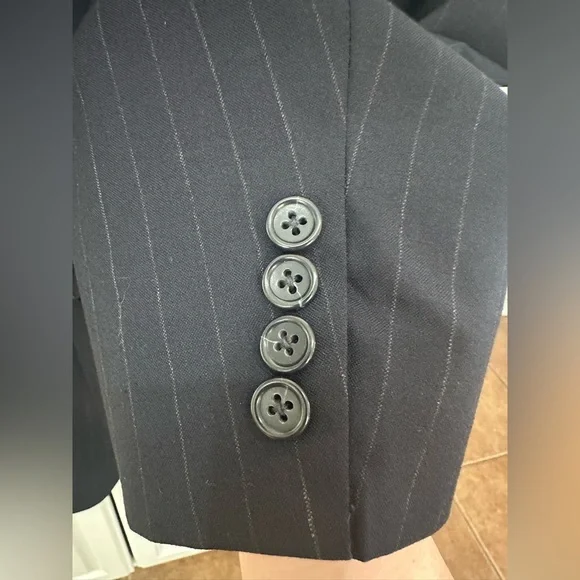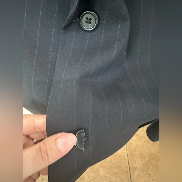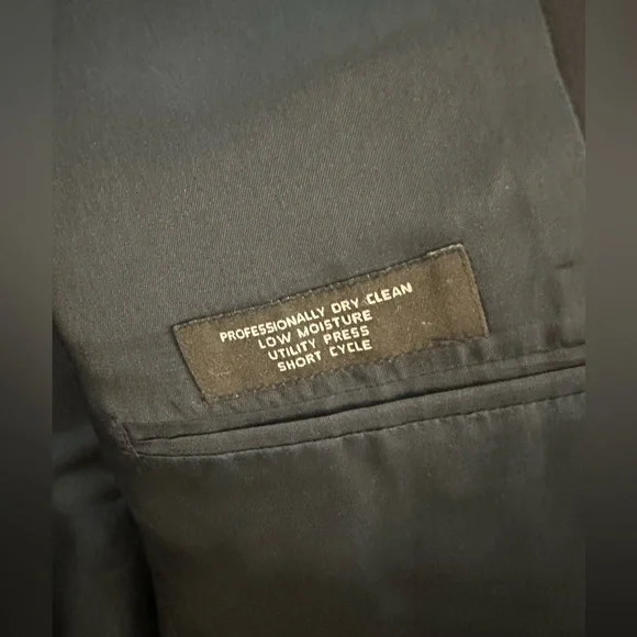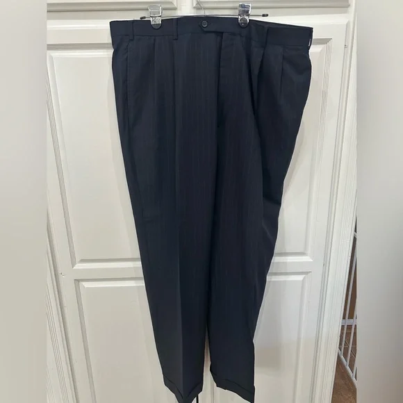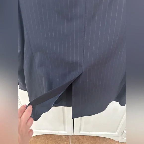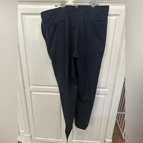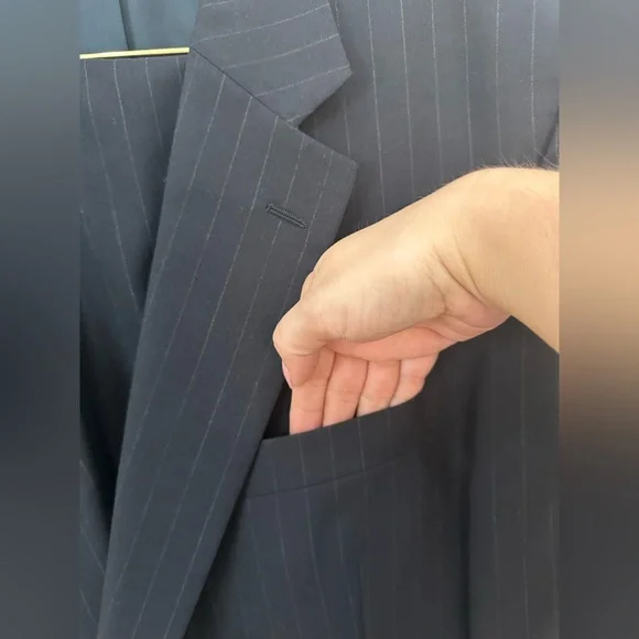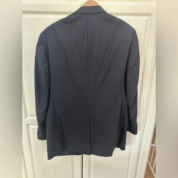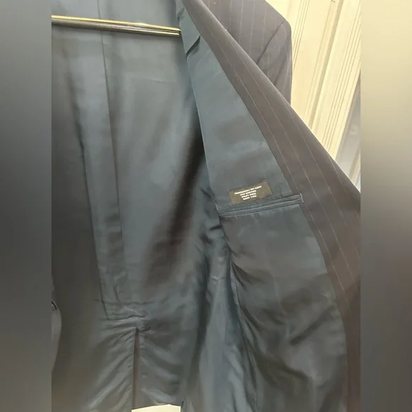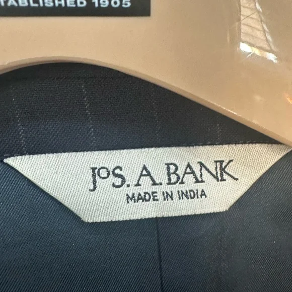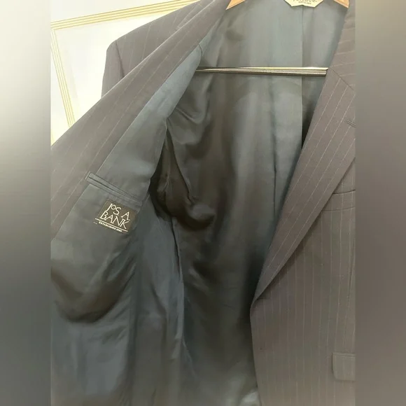Jos. A. Bank Men's Navy Pinstripe Suit Jacket & Pant Set Size 46 Long 100% Wool. This 2 piece suit set is perfect for any formal or business occasion. The jacket features a notch lapel style and a single breasted cut with two front buttons. The jacket is single-vented and has a four-button sleeve style. The pants have a straight leg style and a 30 inch inseam. The suit is made of 100% wool and is navy in color with a striped pattern. The jacket is regular fit and the pants waist is size 42 inches. The suit is made in India and should be dry cleaned only.**The Jacket has one cracked button**Jacket Length: 34 inchesJacket Sleeve: 26 inchesPit-to-Pit: 25 inchesPant Length: 43 inchesPant Inseam: 30 inchesPant Waist: 42 inches