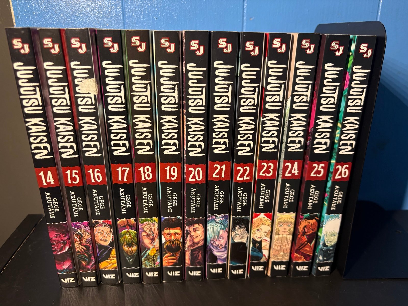 up to date set of jjk!! varying condition, as i collected them over time. i’d say its overall great condition though. slide 5 shows some of their page color, no yellowing at all. volume 16 has a tear on the spine.