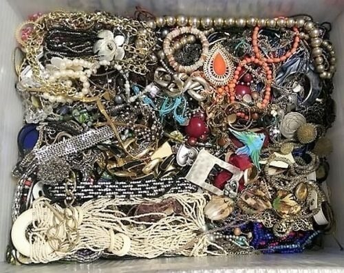 This is a craft lot, some will be wearable, Boxes full of an assorted mix of pieces, parts, beads, necklaces, chains, bracelets, clasps, single earrings, brooches missing stones, chains, watches, and more all pulled from the piles in the photos, unsearched and nothing tested. Photo is sample.... These boxes are Loaded with pounds of goodies!