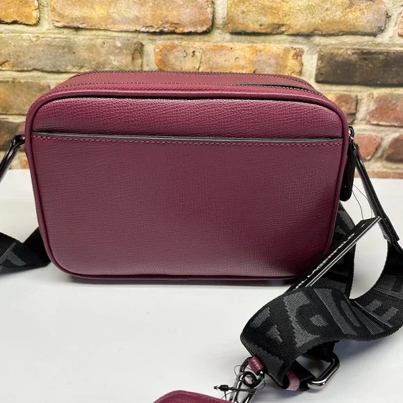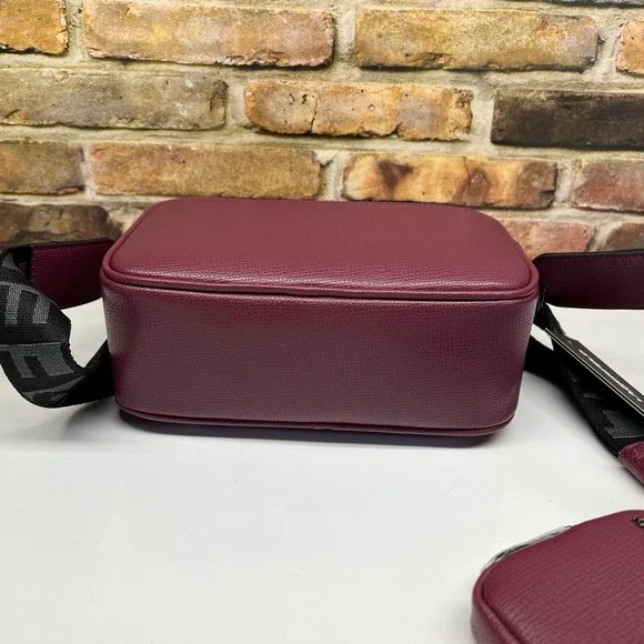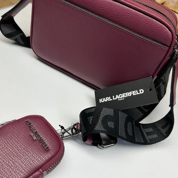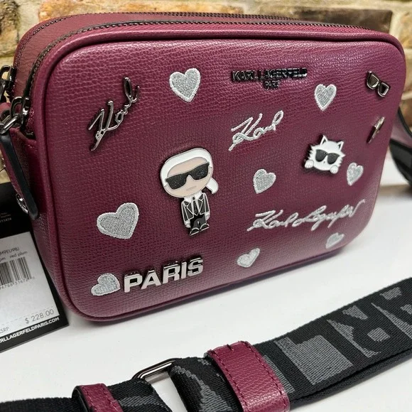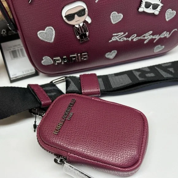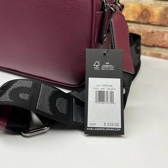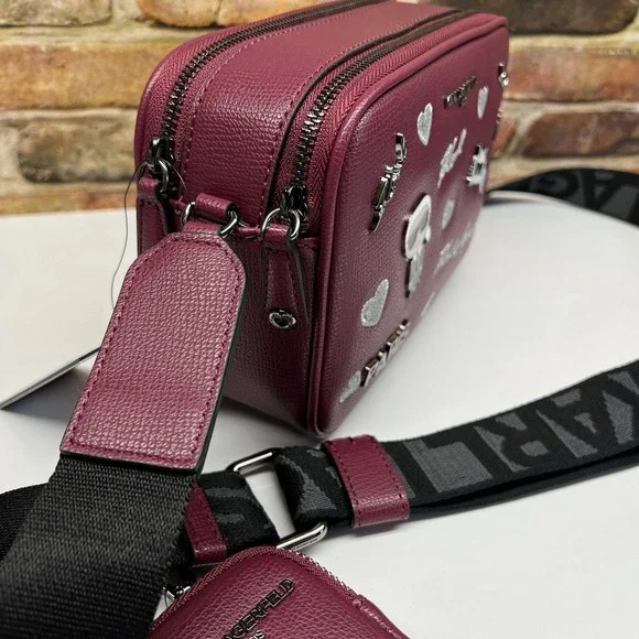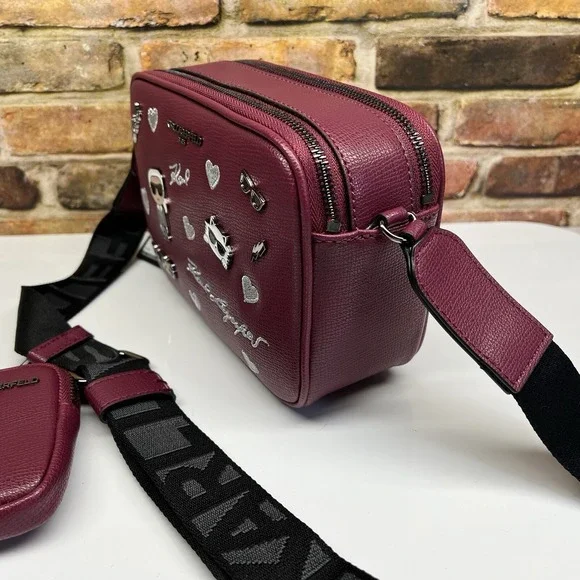 This Karl Lagerfeld Paris Maybelle Cate Pins Camera Crossbody Bag in Red Plum Burgundy is a stylish and versatile addition to any wardrobe. The bag features a pebbled finish, colorblock pattern, and logo lining. It has a double zipper closure, adjustable crossbody strap, and outside slip pocket for easy access. The bag is made of faux leather and has a black canvas logo/faux leather handle style. The hardware is silver tone and the accents are a logo. The bag is small/medium in size, has a rectangular shape, and measures 9 inches in width, 6 inches in height, and 3 inches in depth. The bag is perfect for parties, cocktails, casual outings, workwear, and business settings. The product line is Maybelle and the theme is Cat and Paris.