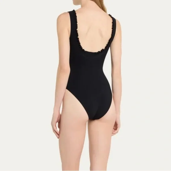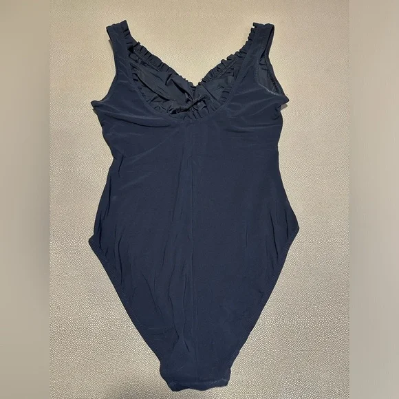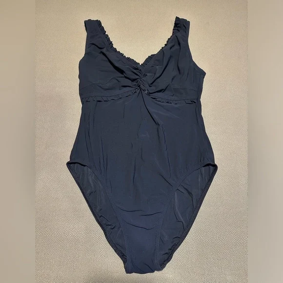 Karla Colletto Swim's one-piece swimsuit showcases a twisted bust detail and ruffle trimming. Supported with underwire, this tank-like piece features a full coverage design.Ruffle twist V neckShell: 75% nylon/25% lycra spandexLinedHand washMade in the USA of imported materialsPre-worn Very Good Condition Some Color loss under arm in back. See picture