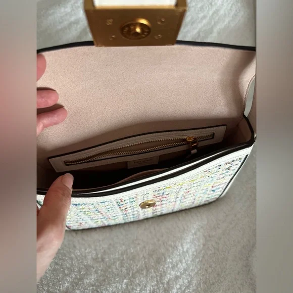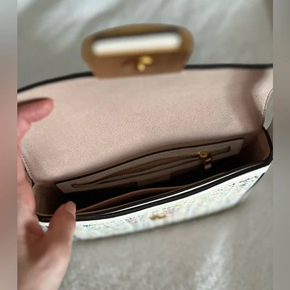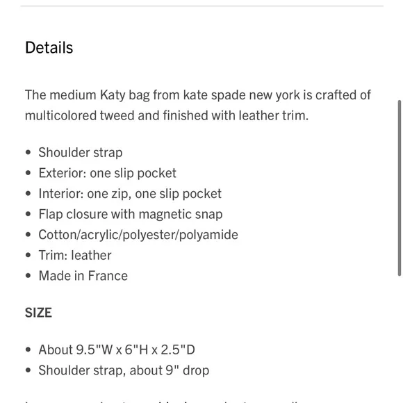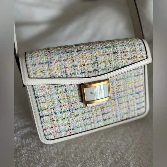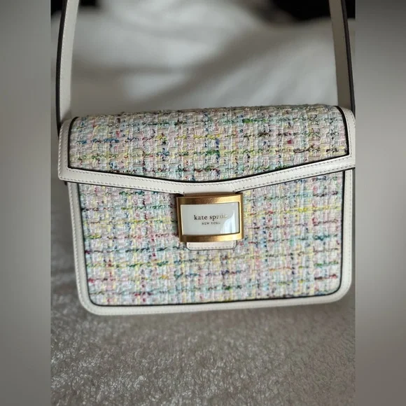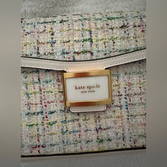 Used 2x— it’s in perfect condition! No imperfections. The medium Katy bag from kate spade new york is crafted of multicolored tweed and finished with leather trim.Shoulder strapExterior: one slip pocketInterior: one zip, one slip pocketFlap closure with magnetic snapCotton/acrylic/polyester/polyamideTrim: leatherMade in FranceSIZEAbout 9.5"W x 6"H x 2.5"DShoulder strap, about 9" dropStyle Code:0400018972146