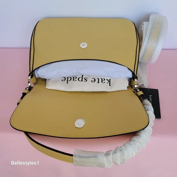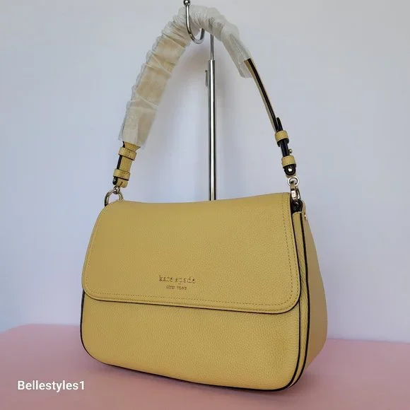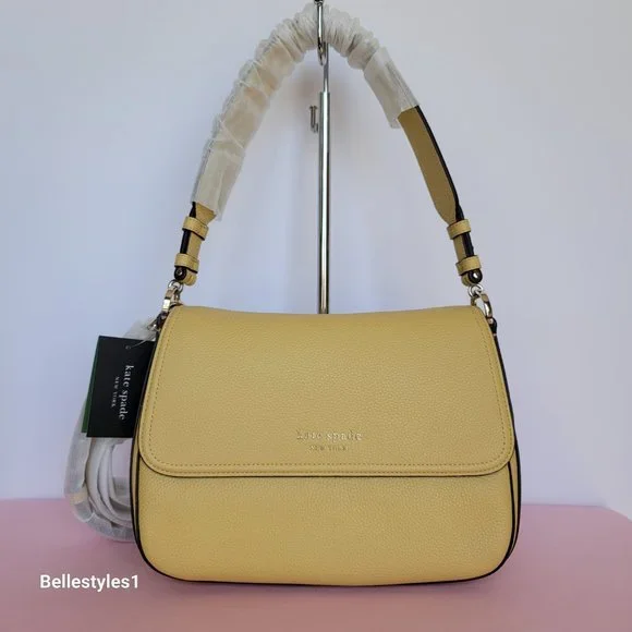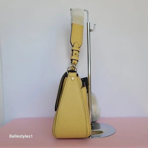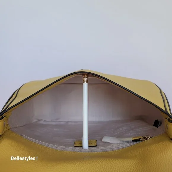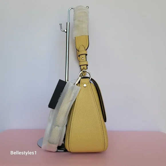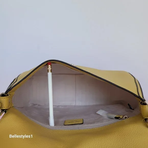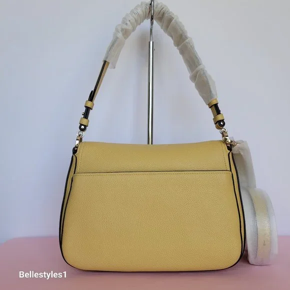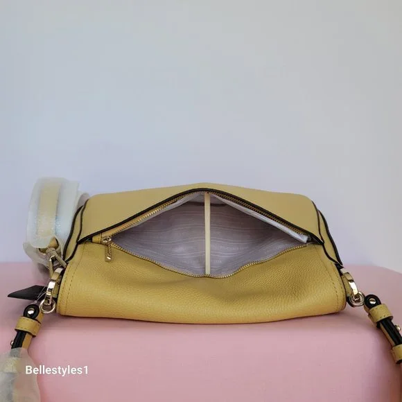 BRAND NEW WITH TAGS. Mullein color. A stylish shoulder bag with flap-over closure with a roomy interior to carry your essentials. Designed with a top handle and a detachable crossbody strap for versatile wear, crafted of soft pebbled leather. Features a back zip pocket for easy access and added storage.Features:• Pebbled leather• Signature fabric lining• Flap-over with magnetic-snap closure• Soft gold-tone hardware• Pinmount logo• Exterior: 1 back zip pocket• Interior: 1 zip pocket, 1 slip pocket• Non-detachable Top handle 9” drop• Detachable/adjustable strap with 22.5” drop for shoulder or crossbody wear• Medium sized bag Approx. 10.5” W x 7.5” H x 4.25” D (Width is measured across the bottom of the bag)• Dust bag included. Style K6577