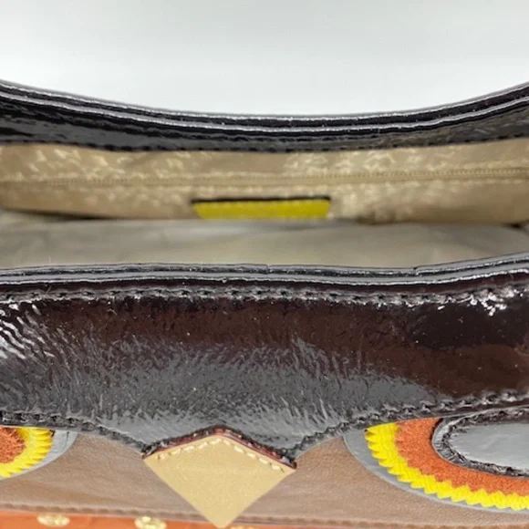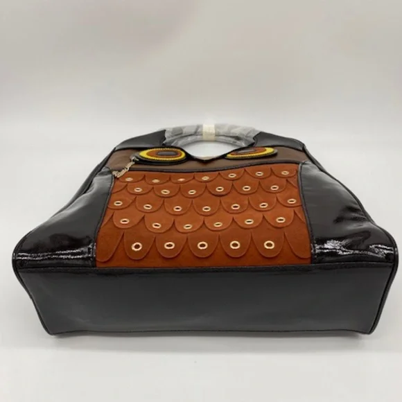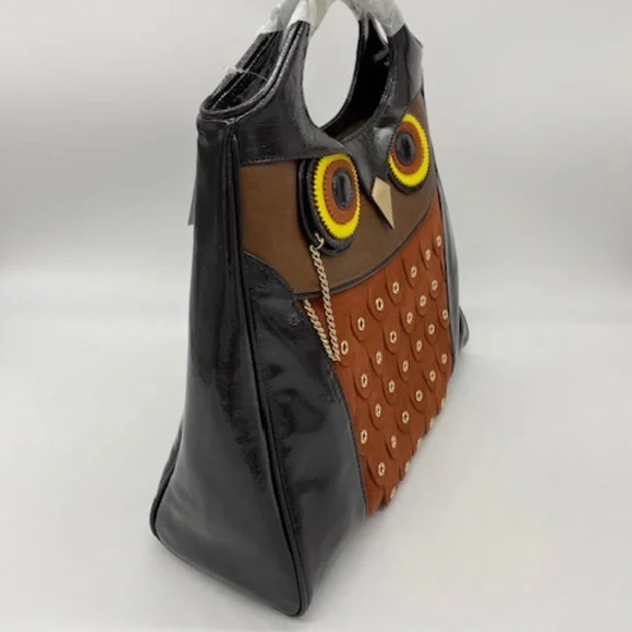 Brand New & Authentic Kate Spade New York Maxwell THE OWL Handbag; Fabulous~VINTAGE~This Kate Spade handbag is crafted of dark brown patent leather and suede.Impressive detail, wide friendly eyes and individual suede feathers accented with gold toned grommets make this limited edition Kate Spade handbag a must have! The interior is lined in her signature jacquard noel orange fabric; an interior zip pocket and double slide pockets accented with leather complete the inside.Carrying the handbag is made easy via the cut handles, always looking fabulous, with a strap drop of 3 ¼”. The finishing touches to this classic Kate Spade are the enamel Kate Spade New York logo on the side.Measures 13” wide x 10 ½” tall 4 ½” thick; purchased at Kate Spade; comes with its Kate Spade sleeper bag, and care card. Stored away and never used~