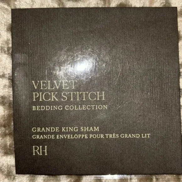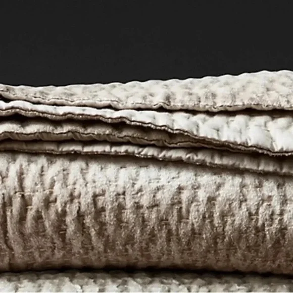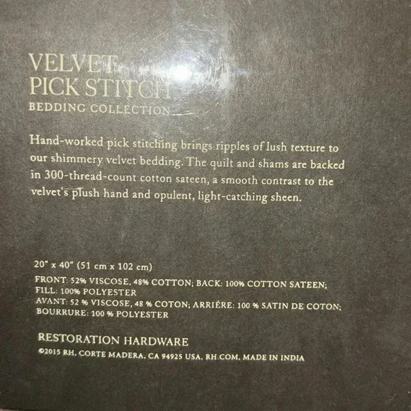 Hand-worked pick stitching brings ripples of lush texture to our shimmery velvet bedding. The grande sham is backed in 300-thread-count cotton sateen, a smooth contrast to the velvet's plush hand and opulent, light-catching sheen. Comes in champagne color. Velvet front is 52% viscose, 48% cotton300-thread-count cotton sateen backHand quilted with pick stitching for rich texture and warmth. Sham has an envelope closure and knife-edge finishQuilt and sham each sold separatelyDry clean onlyMeasures 20” x 40”We have four in stock all in king sizeBrand newRetails for $215.00Each sham is packed separately in aplastic bag.