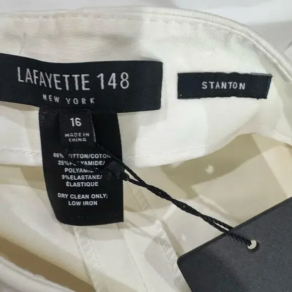 LAFAYETTE 148 Women's Sea Salt Techno Stretch Twill Stanton Pant Size 16 NWT. L148's favorite Stanton pant returns streamlined in technical stretch twill with a smooth finish and resilient shape. Precision cut to a slim leg with slit cropped hems, the fitted shape sits at the waist with a concealed side zip. Slim through thigh and leg Zip side Waist darts Slit side hem High-rise Sits at waist Cropped length 52% Cotton 38% Polyamide 10% Elastane; Italy Machine wash cold or dry clean.pant, pants, women, twill, salt, winter, summer, spring, fall, solid, comfy, casual, travel.May 251