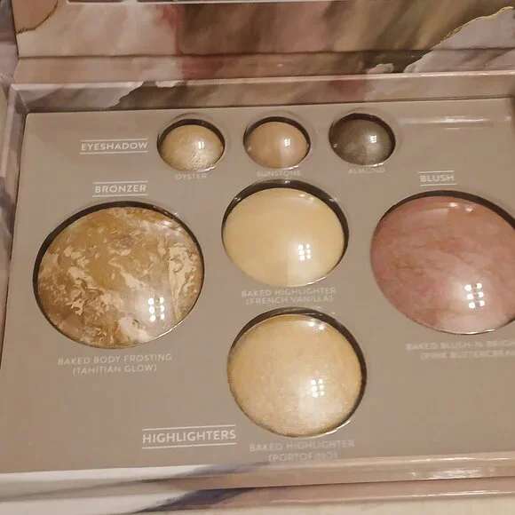 Laura Geller Best of Baked Full Face PaletteIncludes 3 eyeshadows, 2 highlighters, a blush & body frosting; Three 0.018-oz Baked eyeshadows in Oyster, Sunstone & Almond; Two 0.06-oz Baked highlighters in French Vanilla & Portofino; 0.16-oz Blush in Pink Buttercream; 0.16-oz Body Frosting in Tahitian Glow; Mirror included in paletteBrand new; never been used; still in the original packaging