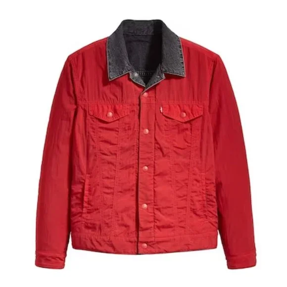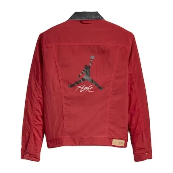 New with tagReversible jacketBlack denim with embossed "Flight" logoRed nylon with black Jordan logoCotton/nylonWhat happens when two iconic brands come together? The ultra, limited edition Levi’s® x Jordan Reversible Trucker Jacket. This reversible Trucker perfectly blends the worlds of street and sport with completely customized detailing, from the co-branded dark copper shank buttons to the unique tag.Denim side:Made from the highest-quality denim, this side features a contrasting crinkle taffeta stripe on the sleeves and collar. On the back you’ll find an embossed Flight logo.Nylon side:Made of a crinkle taffeta that brings warmups to mind, this side features classic Type III stylings, with a screen-printed Jumpman Flight logo on the back.How it FitsRegular fitHits at hipComposition & CareFACE SIDE DETAILS:100% CottonWashed black non-stretch denimEmbossed (raised) Flight logo on the back panelDark copper special co-branded shank buttonCo-branding paper patch on the back hemLocker loop on the back neckREVERSE SIDE:100% NylonNylon crinkle taffeta inspired by classic Jordan warm-upScreen printed Jumpman Flight logo on center backDye to match special co-branded shank buttonCo-branding paper patch on the back hem