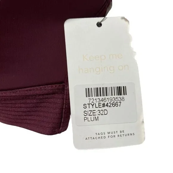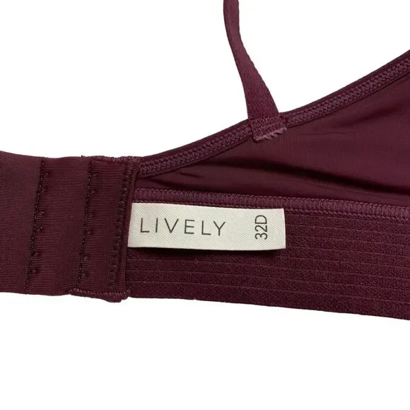 LIVELY New-with-tags The Spacer Bra in Plum. Size 32D. Style #42667. Wireless. Retail: $48.Livley says, "• Thin, lightly padded spacer cups• Wirefree - no poking or digging!• Full cup coverage• Natural, lifted shape + smooth look under tops• Long-lined elastic band• Front adjusting straps for easy fixes• J-hook converts to instant racerback• Adjustable band with 3-level hook-and-eye closure for that perfect "you” fit"I strive to completely and accurately describe all items. All photos are of the actual item unless otherwise specified. Please ask any questions you have before offering or buying. I always try to get back your messages within 24 hours.Thank you so much for looking!--GrenouilleDanielle