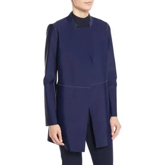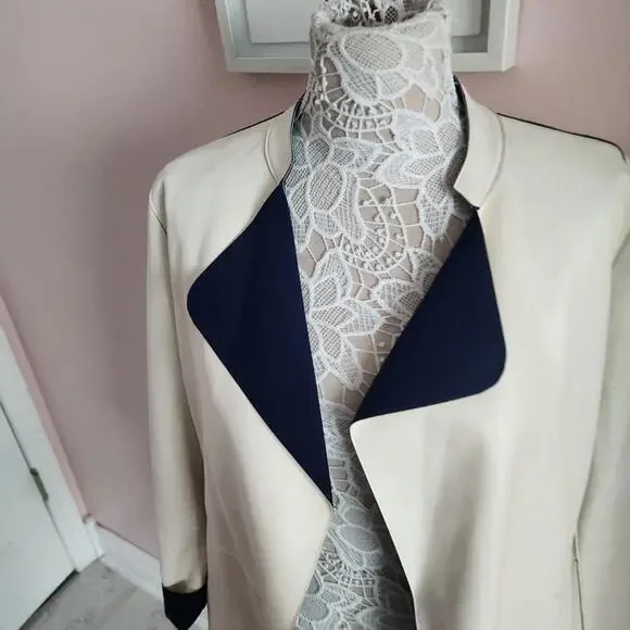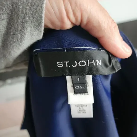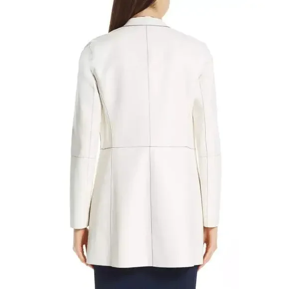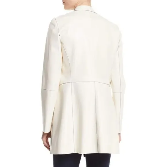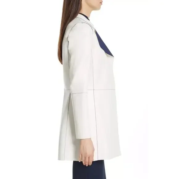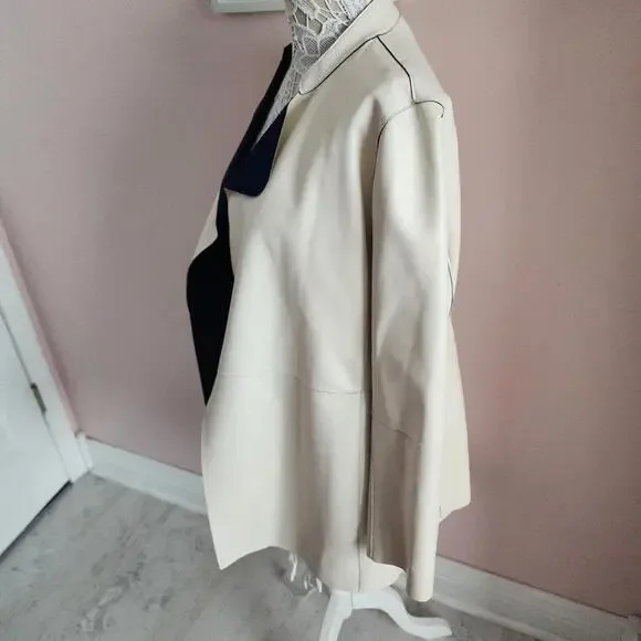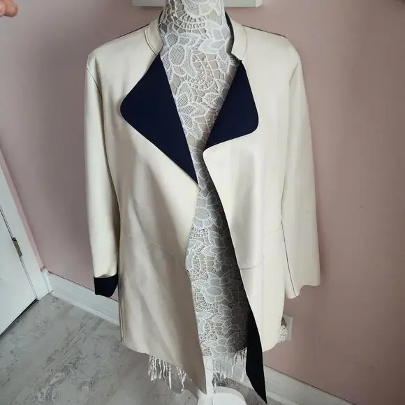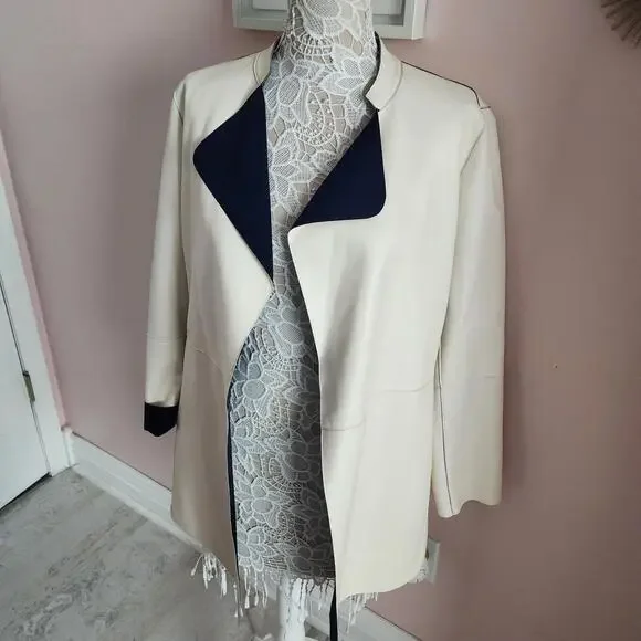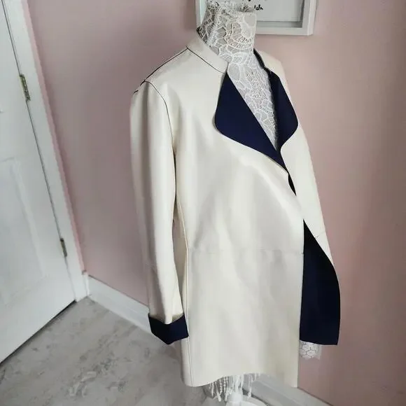 ST JOHN Nautical Alabaster Navy Reversible Leather Long Jacket Size 2 $2495bonded leatherHonestly I do not think this was worn super uniqueChest lying flatarm inseamlength down backshouldersCut from supple leather and lined with a sleek fabric, this lightweight jacket is reversible. The navy and off white palette offers a nautical aesthetic while the wide lapels inject the piece with plenty of coolgirl appeal.Stand collar with wide lapelsLong sleevesOpen frontLining: nylon/spandexLeatherDry clean by leather specialistImported of Italian fabric